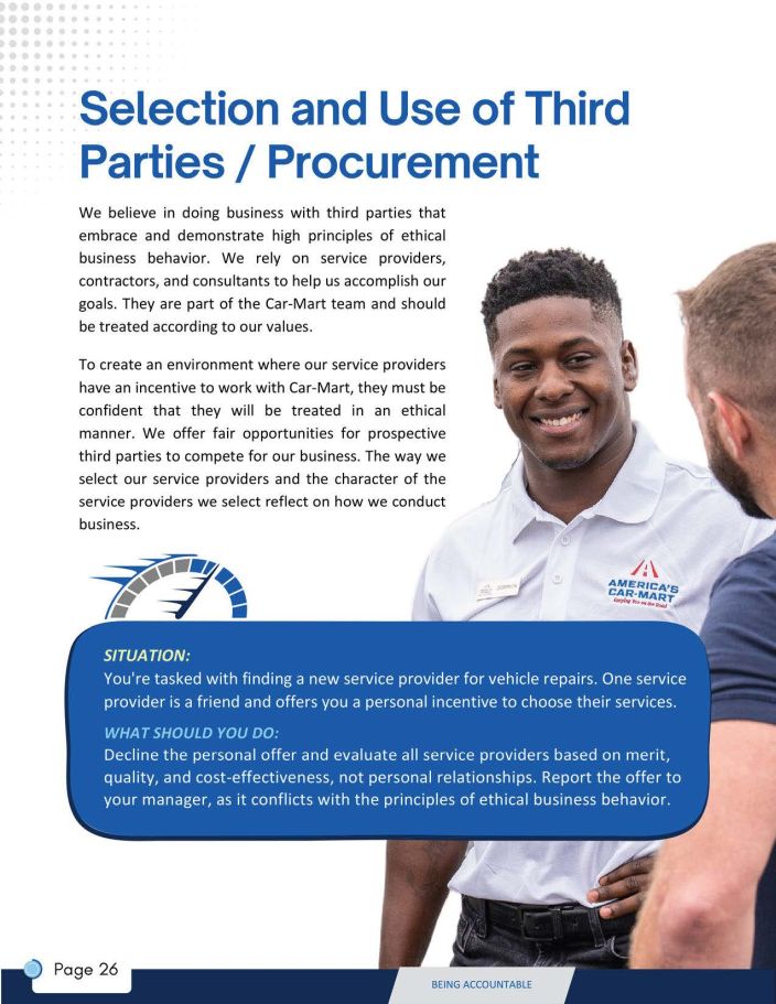 Selection and Use of Third Parties / Procurement Page 26 BEING ACCOUNTABLE We believe in doing business with third parties that embrace and demonstrate high principles of ethical business behavior . We rely on service providers, contractors, and consultants to help us accomplish our goals . They are part of the Car - Mart team and should be treated according to our values . To create an environment where our service providers have an incentive to work with Car - Mart, they must be confident that they will be treated in an ethical manner . We offer fair opportunities for prospective third parties to compete for our business . The way we select our service providers and the character of the service providers we select reflect on how we conduct business .