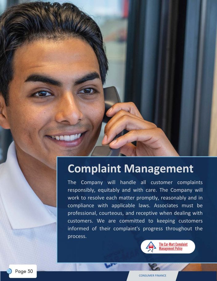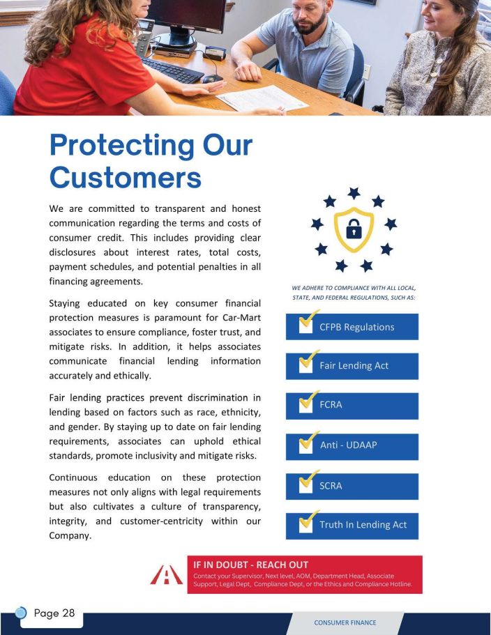 Protecting Our Customers Page 28 CONSUMER FINANCE We are committed to transparent and honest communication regarding the terms and costs of consumer credit . This includes providing clear disclosures about interest rates, total costs, payment schedules, and potential penalties in all financing agreements . Staying educated on key consumer financial protection measures is paramount for Car - Mart associates to ensure compliance, foster trust, and mitigate risks . In addition, it helps associates communicate financial lending information accurately and ethically . Fair lending practices prevent discrimination in lending based on factors such as race, ethnicity, and gender . By staying up to date on fair lending requirements, associates can uphold ethical standards, promote inclusivity and mitigate risks . Continuous education on these protection measures not only aligns with legal requirements but also cultivates a culture of transparency, integrity, and customer - centricity within our Company . WE ADHERE TO COMPLIANCE WITH ALL LOCAL, STATE , AND FEDERAL REGULATIONS , SUCH AS· CFPB Regulations Fair Lending Act FCRA Anti - UDAAP SCRA Truth In Lending Act IF IN DOUBT - REACH OUT Contact your Superv i sor, Next leve l , AOM, Department Head, Assoc i ate Support, Lega l Dept, Compliance Dept, or the Eth i cs and Compliance Hotline