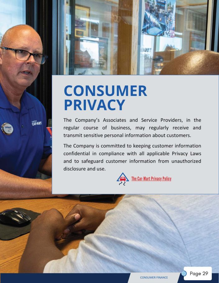 CONSUMER PRIVACY Page 29 CONSUMER FINANCE The Company's Associates and Service Providers, in the regular course of business, may regularly receive and transmit sensitive personal information about customers . The Company is committed to keeping customer information confidential in compliance with all applicable Privacy Laws and to safeguard customer information from unauthorized disclosure and use. A The Car - Mart Privacy Policy _ l