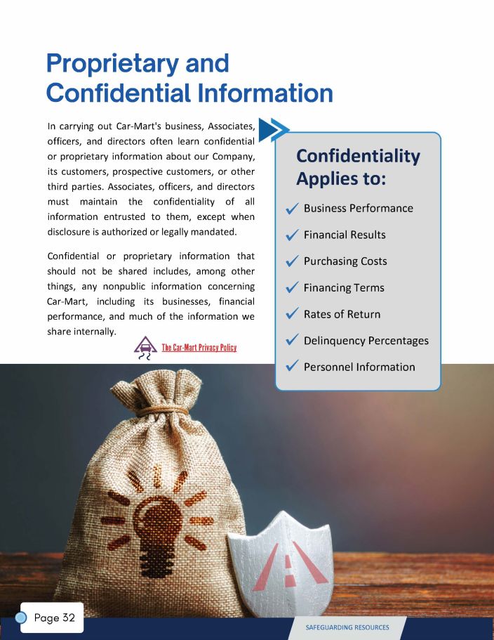 Proprietary and Confidential Information SAFEGUARDING RESOURCES In carrying out Car - Mart's business, Associates, officers, and directors often learn confidential or proprietary information about our Company, its customers, prospective customers, or other third parties . Associates, officers, and directors must maintain the confidentiality of all information entrusted to them, except when disclosure is authorized or legally mandated . Confidential or proprietary information that should not be shared includes, among other things, any nonpublic information concerning Car - Mart, including its businesses, financial performance, and much of the information we share internally . Page 32 A The Car - Mart Privacy Policy t> l Confidentiality Applies to: ✓ Business Performance ✓ Financial Results ✓ Purchasing Costs ✓ Financing Terms ✓ Rates of Return ✓ Delinquency Percentages ✓ Personnel Information