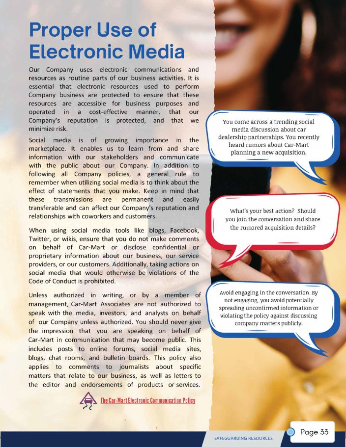 Proper Use of Electronic Media SAFEGUARDING RESOURCES Our Company uses electronic communications and resources as routine parts of our business activities. It is essential that electronic resources used to perform Company business are protected to ensure that these resources are accessible for business purposes and operated in a cost - effective manner, that our Company's reputation is protected, and that we minimize risk . Social media is of growing importance in the marketplace. It enables us to learn from and share information with our stakeholders and communicate with the public about our Company . In addition to following all Company policies, a general rule to remember when utilizing s 6 cial media is to think about the effect of statements that you make . Keep in mind that these transmissions are permanent and easily transferable and can affect our Company's reputation and relationships with coworkers and customers . When using social media tools like blogs, Facebook, Twitter, or wikis, ensure that you do not make comments on behalf of Car - Mart or disclose confidential or proprietary information about our business, our service providers, or our customers . Additionally, taking actions on social media that would otherwise be violations of the Code of Conduct is prohibited . Unless authorized in writing, or by a member of management, Car - Mart Associates are not authorized to speak with the media, investors, and analysts on behalf of our Company unless authorized . You should never give the impression that you are speaking on behalf of Car Mart in communication that may become public . This includes posts to online forums, social media sites, biogs, chat rooms, and bulletin boards . This policy also applies to comments to journalists about specific matters that relate to our business, as well as letters to the editor and endorsements of products or services. A The Car - Mart Electronic Communication Policy "' l. You come across a trending social media discussion about car dealership partnerships. You recently heard rumors about Car - Mart What's your best action? Should you join the conversation and share the rumored acquisition details? Avoid engaging in the conversation. By not engaging, you avoid potentially spreading unconfirmed information or violating the policy against discussing company matters publicly. Page 33