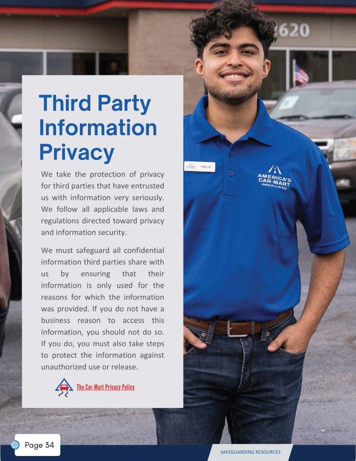 Third Party Information Privacy SAFEGUARDING RESOURCES We take the protection of privacy for third parties that have entrusted us with information very seriously . We follow all applicable laws and regulations directed toward privacy and information security . We must safeguard all confidential information third parties share with us by ensuring that their information is only used for the reasons for which the information was provided . If you do not have a business reason to access this information, you should not do so . If you do, you must also take steps to protect the information against unauthorized use or release . A The Car - Mart Privacy Policy _ l. Page 34