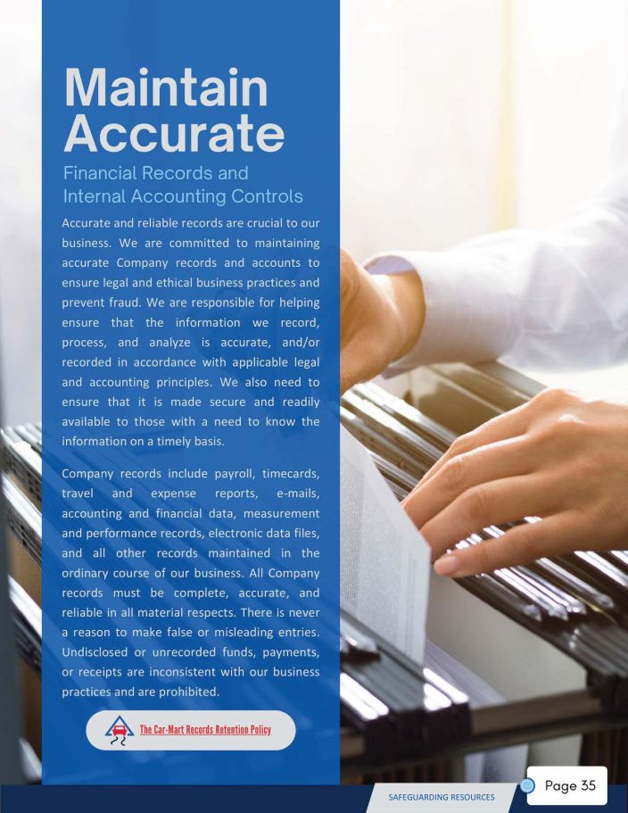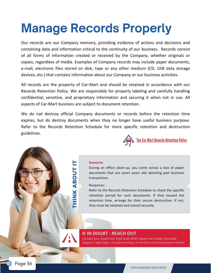 Manage Records Properly Our records are our Company memory, providing evidence of actions and decisions and containing data and information critical to the continuity of our business . Records consist of all forms of information created or received by the Company, whether originals or copies, regardless of media . Examples of Company records may include paper documents, e - mail, electronic files stored on disk, tape or any other medium (CD, USB data storage devices, etc . ) that contains information about our Company or our business activities . All records are the property of Car - Mart and should be retained in accordance with our Records Retention Policy . We are responsible for properly labeling and carefully handling confidential, sensitive, and proprietary information and securing it when not in use . All aspects of Car - Mart business are subject to document retention . We do not destroy official Company documents or records before the retention time expires, but do destroy documents when they no longer have useful business purpose . Refer to the Records Retention Schedule for more specific retention and destruction guidelines. A The Car - Mart Records Retention Policy _ f"l - t - t :> 0 m <( :: - = z - J: t - Scenario: During an office clean - up, you come across a box of paper documents that are seven years old, detailing past business transactions. Response: Refer to the Records Retention Schedule to check the specific retention period for such documents . If they exceed the retention time, arrange for their secure destruction . If not, they must be retained and stored securely . IF IN DOUBT - REACH OUT Contact your Supervisor, Next leve l, AOM, Department Head, Asso c iate SAFEGUARDING RESOURCES S u pport , Lega l Dept, Compliance Dept, or t he Ethics and Compliance Hot line . Page 36