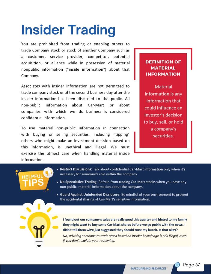 SAFEGUARDING RESOURCES DEFINITION OF MATERIAL INFORMATION Material information is any information that could influence an investor's decision to buy, sell, or hold a company's securities. Page 37 Insider Trading You are prohibited from trading or enabling others to trade Company stock or stock of another Company such as a customer, service provider, competitor, potential acquisition, or alliance while in possession of material nonpublic information ("inside information") about that Company . Associates with insider information are not permitted to trade company stock until the second business day after the insider information has been disclosed to the public . All about we do Car - Mart or about business is considered non - public information companies with which confidential information . To use material non - public information in connection with buying or selling securities, including "tipping" others who might make an investment decision based on this information, is unethical and illegal . We must exercise the utmost care when handling material inside information . Restrict Discussions: Talk about confidential Car - Mart information only when it's necessary for someone's role within the company. No Speculative Trading: Refrain from trading Car - Mart stocks when you have any non - public, material information about the company. Guard Against Unintended Disclosure: Be mindful of your environment to prevent the accidental sharing of Car - Mart's sensitive information. I found out our company's sales are really good this quarter and hinted to my family they might want to buy some Car - Mart shares before we go public with the news. I didn't tell them why; just suggested they should trust my hunch. Is that okay? No, advising someone to trade stock based on insider knowledge is still illegal, even if you don't explain your reasoning.