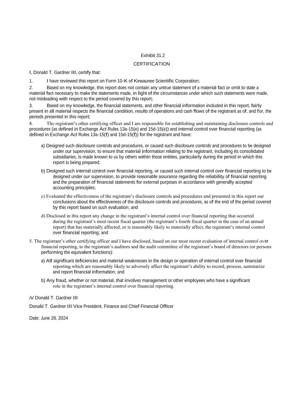 Exhibit 31.2 CERTIFICATION I, Donald T. Gardner III, certify that: 1. I have reviewed this report on Form 10-K of Kewaunee Scientific Corporation; 2. Based on my knowledge, this report does not contain any untrue statement of a material fact or omit to state a material fact necessary to make the statements made, in light of the circumstances under which such statements were made, not misleading with respect to the period covered by this report; 3. Based on my knowledge, the financial statements, and other financial information included in this report, fairly present in all material respects the financial condition, results of operations and cash flows of the registrant as of, and for, the periods presented in this report; 4. The registrant’s other certifying officer and I are responsible for establishing and maintaining disclosure controls and procedures (as defined in Exchange Act Rules 13a-15(e) and 15d-15(e)) and internal control over financial reporting (as defined in Exchange Act Rules 13a-15(f) and 15d-15(f)) for the registrant and have: a) Designed such disclosure controls and procedures, or caused such disclosure controls and procedures to be designed under our supervision, to ensure that material information relating to the registrant, including its consolidated subsidiaries, is made known to us by others within those entities, particularly during the period in which this report is being prepared; b) Designed such internal control over financial reporting, or caused such internal control over financial reporting to be designed under our supervision, to provide reasonable assurance regarding the reliability of financial reporting and the preparation of financial statements for external purposes in accordance with generally accepted accounting principles; c) Evaluated the effectiveness of the registrant’s disclosure controls and procedures and presented in this report our conclusions about the effectiveness of the disclosure controls and procedures, as of the end of the period covered by this report based on such evaluation; and d) Disclosed in this report any change in the registrant’s internal control over financial reporting that occurred during the registrant’s most recent fiscal quarter (the registrant’s fourth fiscal quarter in the case of an annual report) that has materially affected, or is reasonably likely to materially affect, the registrant’s internal control over financial reporting; and 5. The registrant’s other certifying officer and I have disclosed, based on our most recent evaluation of internal control over financial reporting, to the registrant’s auditors and the audit committee of the registrant’s board of directors (or persons performing the equivalent functions): a) All significant deficiencies and material weaknesses in the design or operation of internal control over financial reporting which are reasonably likely to adversely affect the registrant’s ability to record, process, summarize and report financial information; and b) Any fraud, whether or not material, that involves management or other employees who have a significant role in the registrant’s internal control over financial reporting. /s/ Donald T. Gardner III Donald T. Gardner III Vice President, Finance and Chief Financial Officer Date: June 28, 2024