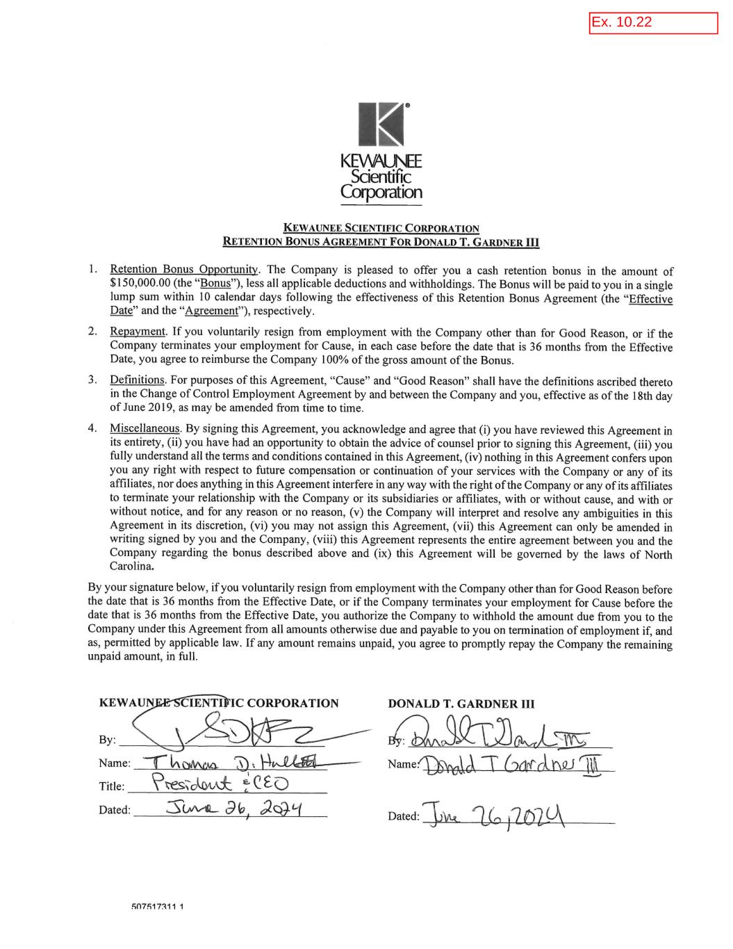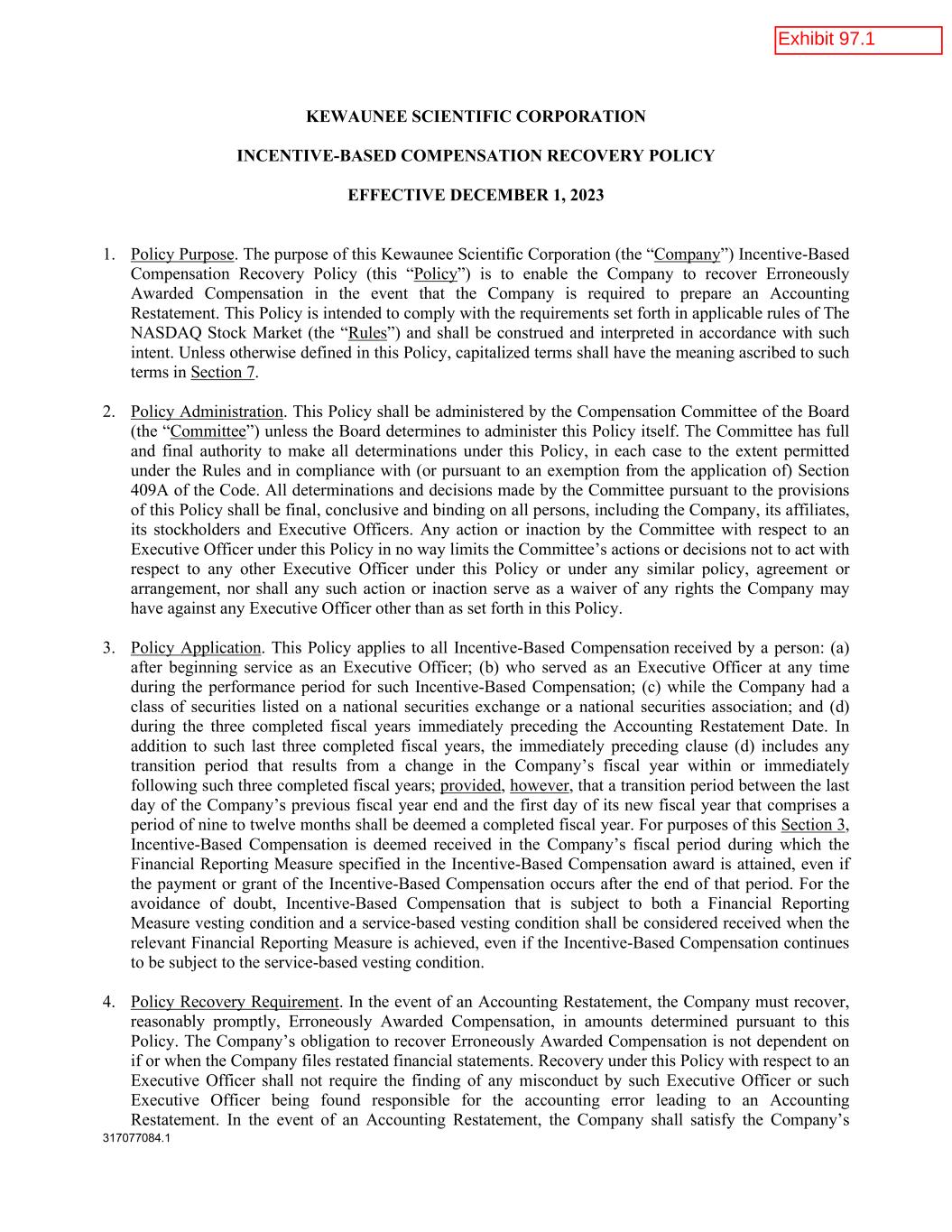 317077084.1 KEWAUNEE SCIENTIFIC CORPORATION INCENTIVE-BASED COMPENSATION RECOVERY POLICY EFFECTIVE DECEMBER 1, 2023 1. Policy Purpose. The purpose of this Kewaunee Scientific Corporation (the “Company”) Incentive-Based Compensation Recovery Policy (this “Policy”) is to enable the Company to recover Erroneously Awarded Compensation in the event that the Company is required to prepare an Accounting Restatement. This Policy is intended to comply with the requirements set forth in applicable rules of The NASDAQ Stock Market (the “Rules”) and shall be construed and interpreted in accordance with such intent. Unless otherwise defined in this Policy, capitalized terms shall have the meaning ascribed to such terms in Section 7. 2. Policy Administration. This Policy shall be administered by the Compensation Committee of the Board (the “Committee”) unless the Board determines to administer this Policy itself. The Committee has full and final authority to make all determinations under this Policy, in each case to the extent permitted under the Rules and in compliance with (or pursuant to an exemption from the application of) Section 409A of the Code. All determinations and decisions made by the Committee pursuant to the provisions of this Policy shall be final, conclusive and binding on all persons, including the Company, its affiliates, its stockholders and Executive Officers. Any action or inaction by the Committee with respect to an Executive Officer under this Policy in no way limits the Committee’s actions or decisions not to act with respect to any other Executive Officer under this Policy or under any similar policy, agreement or arrangement, nor shall any such action or inaction serve as a waiver of any rights the Company may have against any Executive Officer other than as set forth in this Policy. 3. Policy Application. This Policy applies to all Incentive-Based Compensation received by a person: (a) after beginning service as an Executive Officer; (b) who served as an Executive Officer at any time during the performance period for such Incentive-Based Compensation; (c) while the Company had a class of securities listed on a national securities exchange or a national securities association; and (d) during the three completed fiscal years immediately preceding the Accounting Restatement Date. In addition to such last three completed fiscal years, the immediately preceding clause (d) includes any transition period that results from a change in the Company’s fiscal year within or immediately following such three completed fiscal years; provided, however, that a transition period between the last day of the Company’s previous fiscal year end and the first day of its new fiscal year that comprises a period of nine to twelve months shall be deemed a completed fiscal year. For purposes of this Section 3, Incentive-Based Compensation is deemed received in the Company’s fiscal period during which the Financial Reporting Measure specified in the Incentive-Based Compensation award is attained, even if the payment or grant of the Incentive-Based Compensation occurs after the end of that period. For the avoidance of doubt, Incentive-Based Compensation that is subject to both a Financial Reporting Measure vesting condition and a service-based vesting condition shall be considered received when the relevant Financial Reporting Measure is achieved, even if the Incentive-Based Compensation continues to be subject to the service-based vesting condition. 4. Policy Recovery Requirement. In the event of an Accounting Restatement, the Company must recover, reasonably promptly, Erroneously Awarded Compensation, in amounts determined pursuant to this Policy. The Company’s obligation to recover Erroneously Awarded Compensation is not dependent on if or when the Company files restated financial statements. Recovery under this Policy with respect to an Executive Officer shall not require the finding of any misconduct by such Executive Officer or such Executive Officer being found responsible for the accounting error leading to an Accounting Restatement. In the event of an Accounting Restatement, the Company shall satisfy the Company’s
