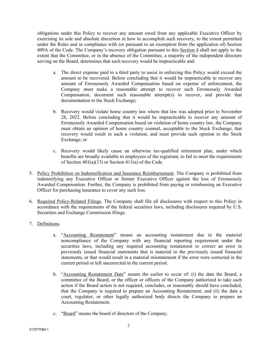 2 317077084.1 obligations under this Policy to recover any amount owed from any applicable Executive Officer by exercising its sole and absolute discretion in how to accomplish such recovery, to the extent permitted under the Rules and in compliance with (or pursuant to an exemption from the application of) Section 409A of the Code. The Company’s recovery obligation pursuant to this Section 4 shall not apply to the extent that the Committee, or in the absence of the Committee, a majority of the independent directors serving on the Board, determines that such recovery would be impracticable and: a. The direct expense paid to a third party to assist in enforcing this Policy would exceed the amount to be recovered. Before concluding that it would be impracticable to recover any amount of Erroneously Awarded Compensation based on expense of enforcement, the Company must make a reasonable attempt to recover such Erroneously Awarded Compensation, document such reasonable attempt(s) to recover, and provide that documentation to the Stock Exchange; b. Recovery would violate home country law where that law was adopted prior to November 28, 2022. Before concluding that it would be impracticable to recover any amount of Erroneously Awarded Compensation based on violation of home country law, the Company must obtain an opinion of home country counsel, acceptable to the Stock Exchange, that recovery would result in such a violation, and must provide such opinion to the Stock Exchange; or c. Recovery would likely cause an otherwise tax-qualified retirement plan, under which benefits are broadly available to employees of the registrant, to fail to meet the requirements of Section 401(a)(13) or Section 411(a) of the Code. 5. Policy Prohibition on Indemnification and Insurance Reimbursement. The Company is prohibited from indemnifying any Executive Officer or former Executive Officer against the loss of Erroneously Awarded Compensation. Further, the Company is prohibited from paying or reimbursing an Executive Officer for purchasing insurance to cover any such loss. 6. Required Policy-Related Filings. The Company shall file all disclosures with respect to this Policy in accordance with the requirements of the federal securities laws, including disclosures required by U.S. Securities and Exchange Commission filings. 7. Definitions. a. “Accounting Restatement” means an accounting restatement due to the material noncompliance of the Company with any financial reporting requirement under the securities laws, including any required accounting restatement to correct an error in previously issued financial statements that is material to the previously issued financial statements, or that would result in a material misstatement if the error were corrected in the current period or left uncorrected in the current period. b. “Accounting Restatement Date” means the earlier to occur of: (i) the date the Board, a committee of the Board, or the officer or officers of the Company authorized to take such action if the Board action is not required, concludes, or reasonably should have concluded, that the Company is required to prepare an Accounting Restatement; and (ii) the date a court, regulator, or other legally authorized body directs the Company to prepare an Accounting Restatement. c. “Board” means the board of directors of the Company.