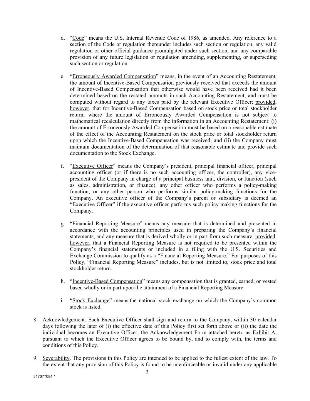 3 317077084.1 d. “Code” means the U.S. Internal Revenue Code of 1986, as amended. Any reference to a section of the Code or regulation thereunder includes such section or regulation, any valid regulation or other official guidance promulgated under such section, and any comparable provision of any future legislation or regulation amending, supplementing, or superseding such section or regulation. e. “Erroneously Awarded Compensation” means, in the event of an Accounting Restatement, the amount of Incentive-Based Compensation previously received that exceeds the amount of Incentive-Based Compensation that otherwise would have been received had it been determined based on the restated amounts in such Accounting Restatement, and must be computed without regard to any taxes paid by the relevant Executive Officer; provided, however, that for Incentive-Based Compensation based on stock price or total stockholder return, where the amount of Erroneously Awarded Compensation is not subject to mathematical recalculation directly from the information in an Accounting Restatement: (i) the amount of Erroneously Awarded Compensation must be based on a reasonable estimate of the effect of the Accounting Restatement on the stock price or total stockholder return upon which the Incentive-Based Compensation was received; and (ii) the Company must maintain documentation of the determination of that reasonable estimate and provide such documentation to the Stock Exchange. f. “Executive Officer” means the Company’s president, principal financial officer, principal accounting officer (or if there is no such accounting officer, the controller), any vice- president of the Company in charge of a principal business unit, division, or function (such as sales, administration, or finance), any other officer who performs a policy-making function, or any other person who performs similar policy-making functions for the Company. An executive officer of the Company’s parent or subsidiary is deemed an “Executive Officer” if the executive officer performs such policy making functions for the Company. g. “Financial Reporting Measure” means any measure that is determined and presented in accordance with the accounting principles used in preparing the Company’s financial statements, and any measure that is derived wholly or in part from such measure; provided, however, that a Financial Reporting Measure is not required to be presented within the Company’s financial statements or included in a filing with the U.S. Securities and Exchange Commission to qualify as a “Financial Reporting Measure.” For purposes of this Policy, “Financial Reporting Measure” includes, but is not limited to, stock price and total stockholder return. h. “Incentive-Based Compensation” means any compensation that is granted, earned, or vested based wholly or in part upon the attainment of a Financial Reporting Measure. i. “Stock Exchange” means the national stock exchange on which the Company’s common stock is listed. 8. Acknowledgement. Each Executive Officer shall sign and return to the Company, within 30 calendar days following the later of (i) the effective date of this Policy first set forth above or (ii) the date the individual becomes an Executive Officer, the Acknowledgement Form attached hereto as Exhibit A, pursuant to which the Executive Officer agrees to be bound by, and to comply with, the terms and conditions of this Policy. 9. Severability. The provisions in this Policy are intended to be applied to the fullest extent of the law. To the extent that any provision of this Policy is found to be unenforceable or invalid under any applicable