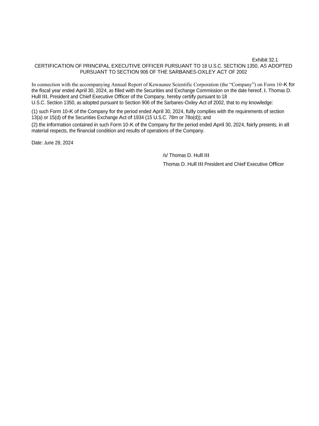 Exhibit 32.1 CERTIFICATION OF PRINCIPAL EXECUTIVE OFFICER PURSUANT TO 18 U.S.C. SECTION 1350, AS ADOPTED PURSUANT TO SECTION 906 OF THE SARBANES-OXLEY ACT OF 2002 In connection with the accompanying Annual Report of Kewaunee Scientific Corporation (the “Company”) on Form 10-K for the fiscal year ended April 30, 2024, as filed with the Securities and Exchange Commission on the date hereof, I, Thomas D. Hull III, President and Chief Executive Officer of the Company, hereby certify pursuant to 18 U.S.C. Section 1350, as adopted pursuant to Section 906 of the Sarbanes-Oxley Act of 2002, that to my knowledge: (1) such Form 10-K of the Company for the period ended April 30, 2024, fully complies with the requirements of section 13(a) or 15(d) of the Securities Exchange Act of 1934 (15 U.S.C. 78m or 78o(d)); and (2) the information contained in such Form 10-K of the Company for the period ended April 30, 2024, fairly presents, in all material respects, the financial condition and results of operations of the Company. Date: June 28, 2024 /s/ Thomas D. Hull III Thomas D. Hull III President and Chief Executive Officer
