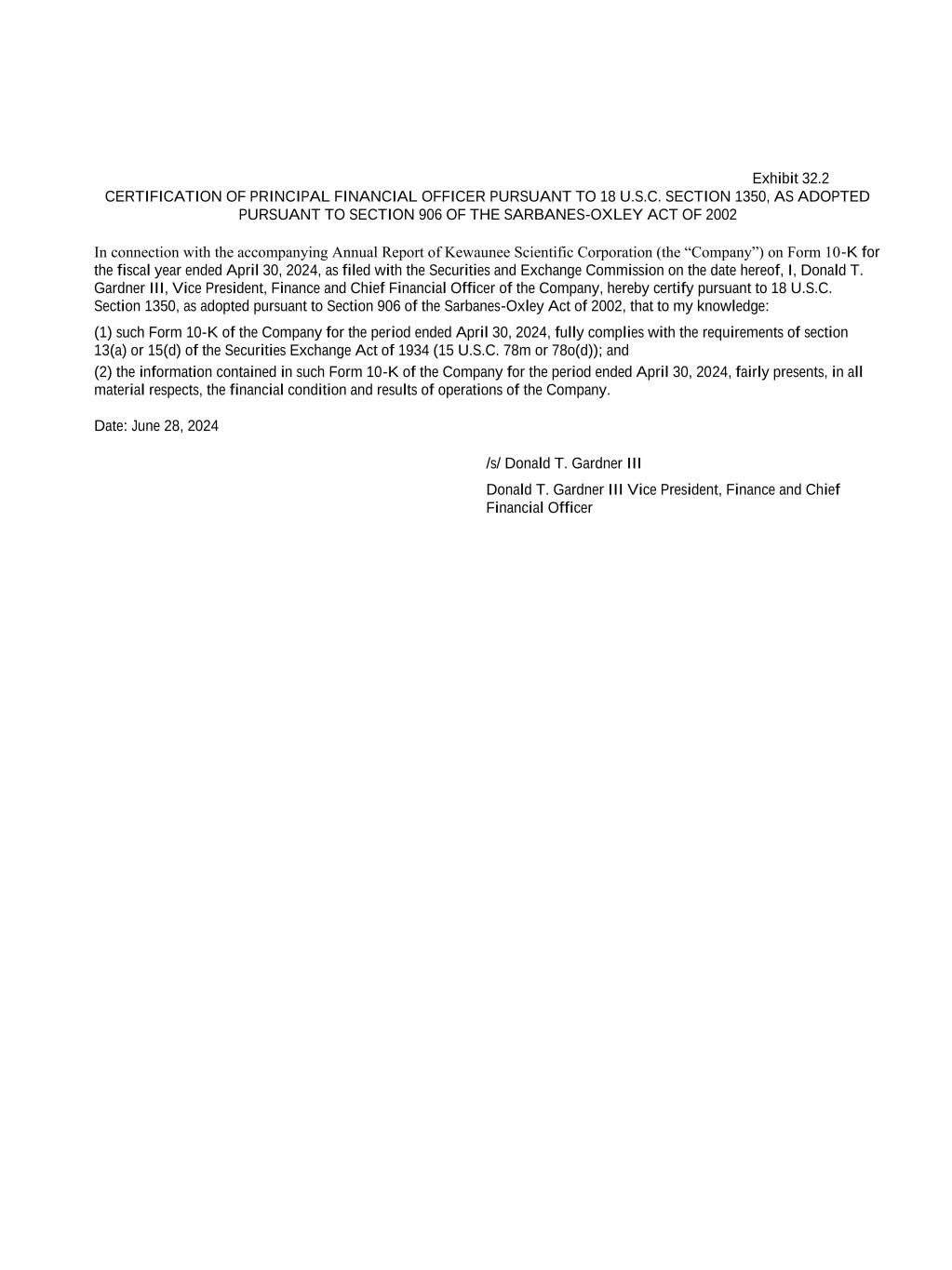 Exhibit 32.2 CERTIFICATION OF PRINCIPAL FINANCIAL OFFICER PURSUANT TO 18 U.S.C. SECTION 1350, AS ADOPTED PURSUANT TO SECTION 906 OF THE SARBANES-OXLEY ACT OF 2002 In connection with the accompanying Annual Report of Kewaunee Scientific Corporation (the “Company”) on Form 10-K for the fiscal year ended April 30, 2024, as filed with the Securities and Exchange Commission on the date hereof, I, Donald T. Gardner III, Vice President, Finance and Chief Financial Officer of the Company, hereby certify pursuant to 18 U.S.C. Section 1350, as adopted pursuant to Section 906 of the Sarbanes-Oxley Act of 2002, that to my knowledge: (1) such Form 10-K of the Company for the period ended April 30, 2024, fully complies with the requirements of section 13(a) or 15(d) of the Securities Exchange Act of 1934 (15 U.S.C. 78m or 78o(d)); and (2) the information contained in such Form 10-K of the Company for the period ended April 30, 2024, fairly presents, in all material respects, the financial condition and results of operations of the Company. Date: June 28, 2024 /s/ Donald T. Gardner III Donald T. Gardner III Vice President, Finance and Chief Financial Officer