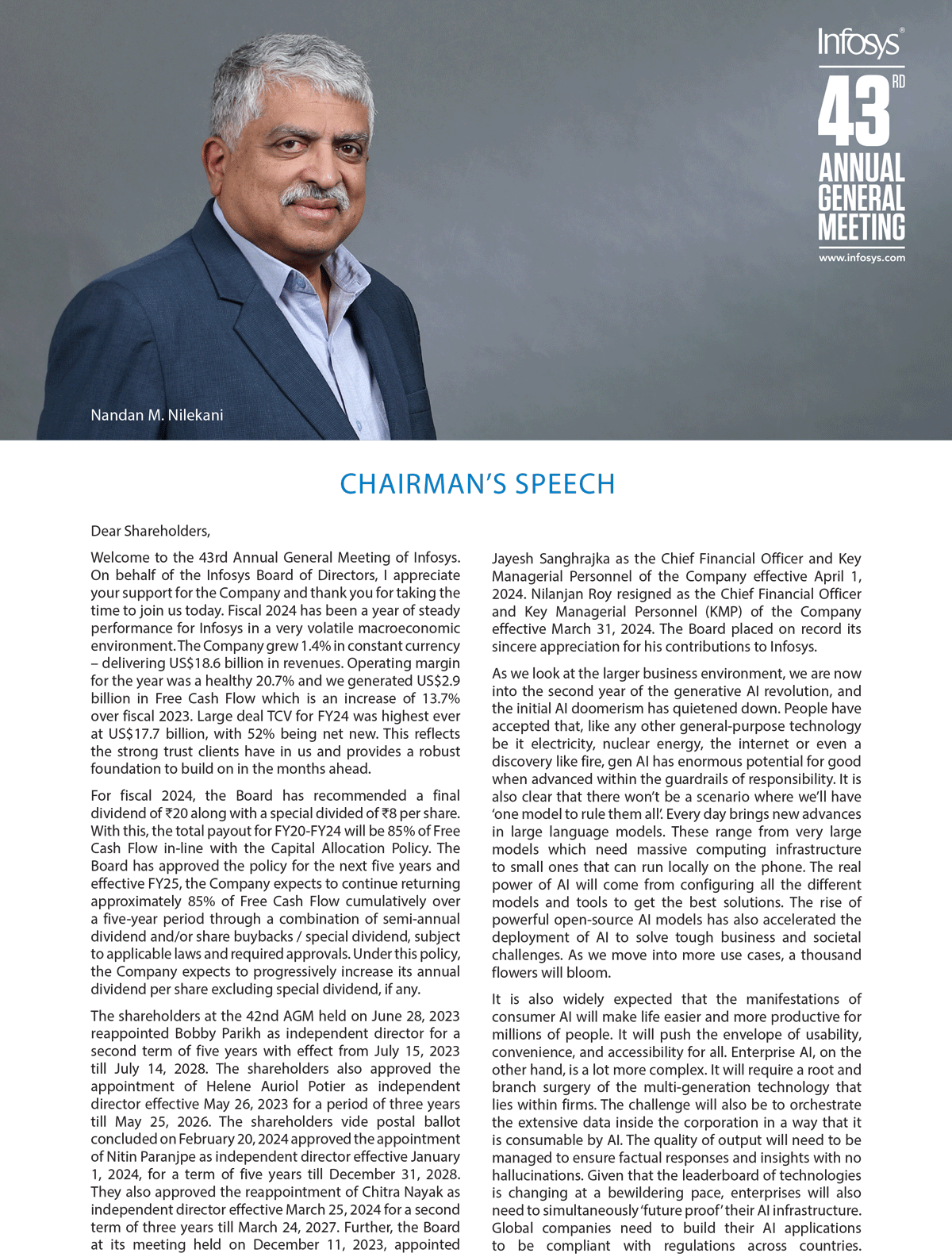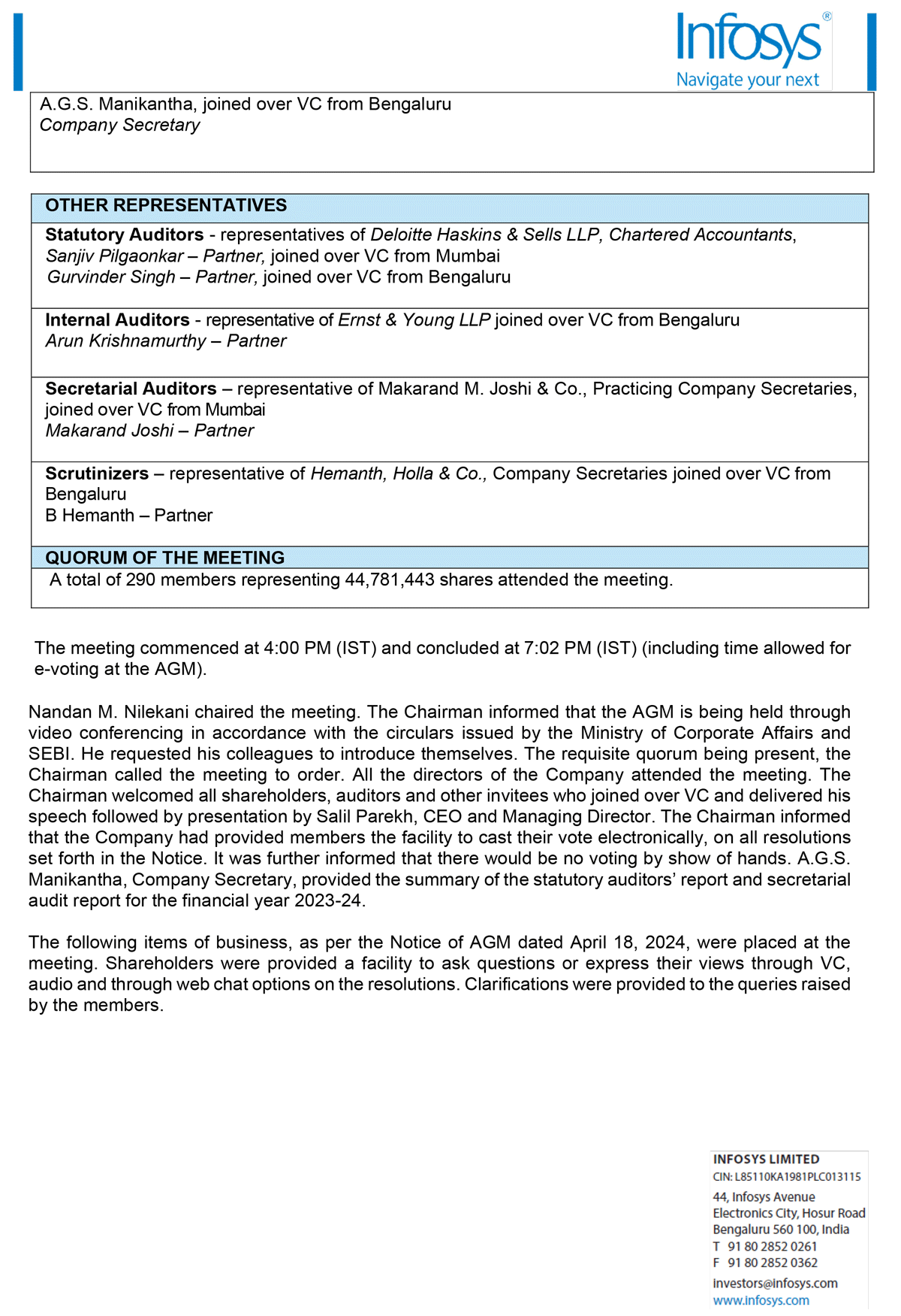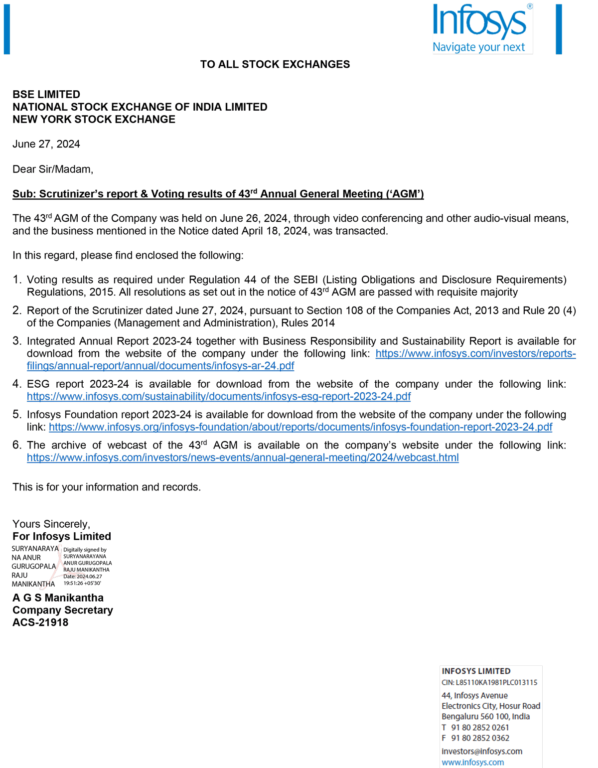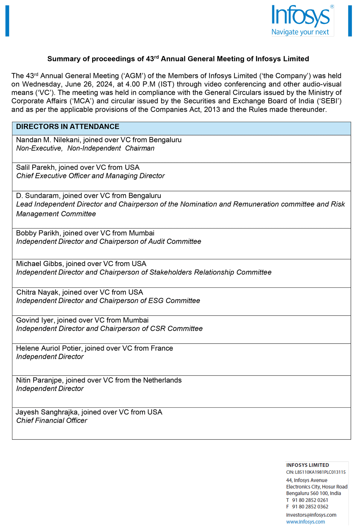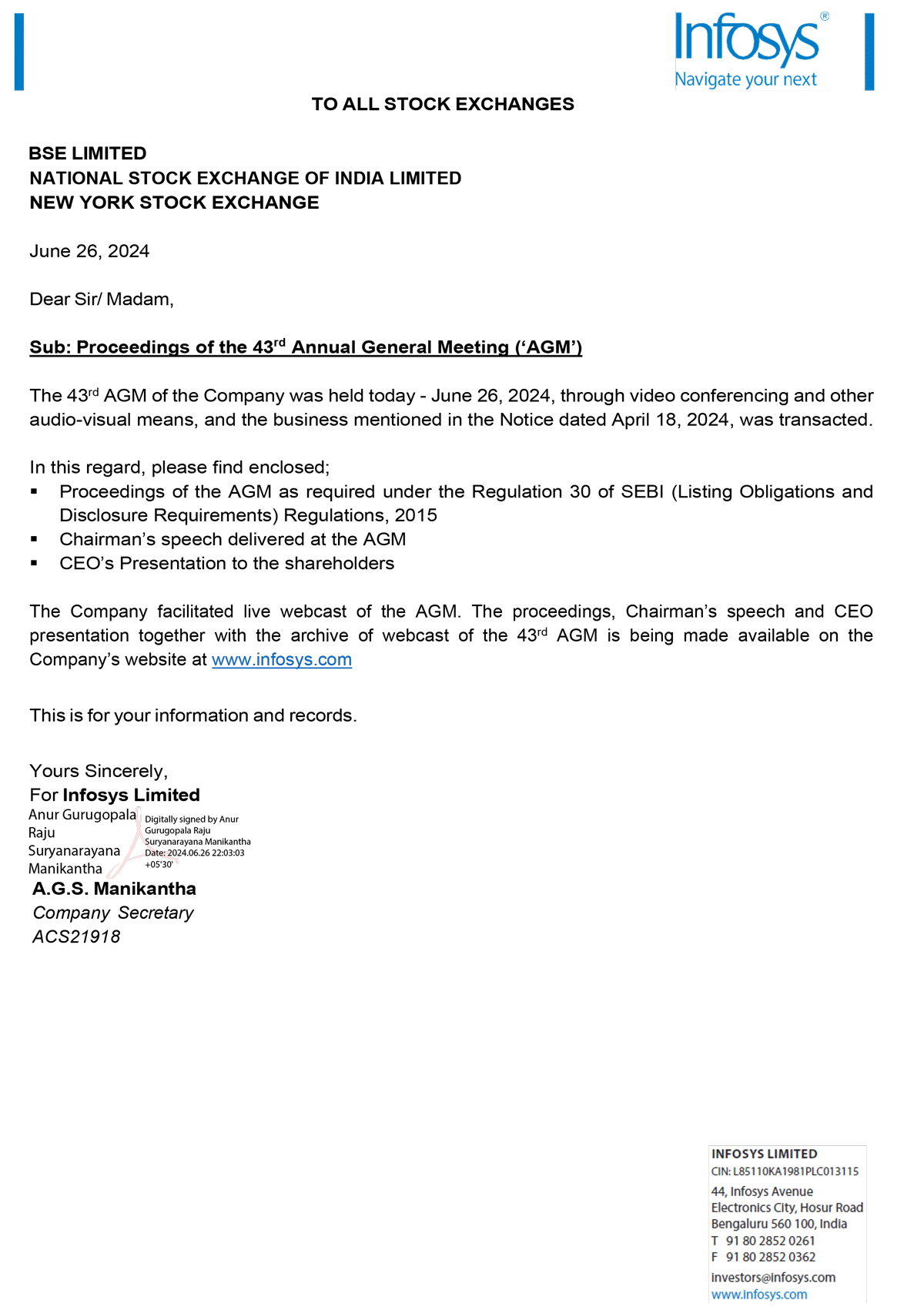 Infosys Limited, a company organized under the laws of the Republic of India ("Infosys", or the "Company"), hereby furnishes with the United States Securities and Exchange Commission this Report on Form 6-K regarding the outcome of the 43rd Annual General Meeting (AGM) of the Company held on June 26, 2024.