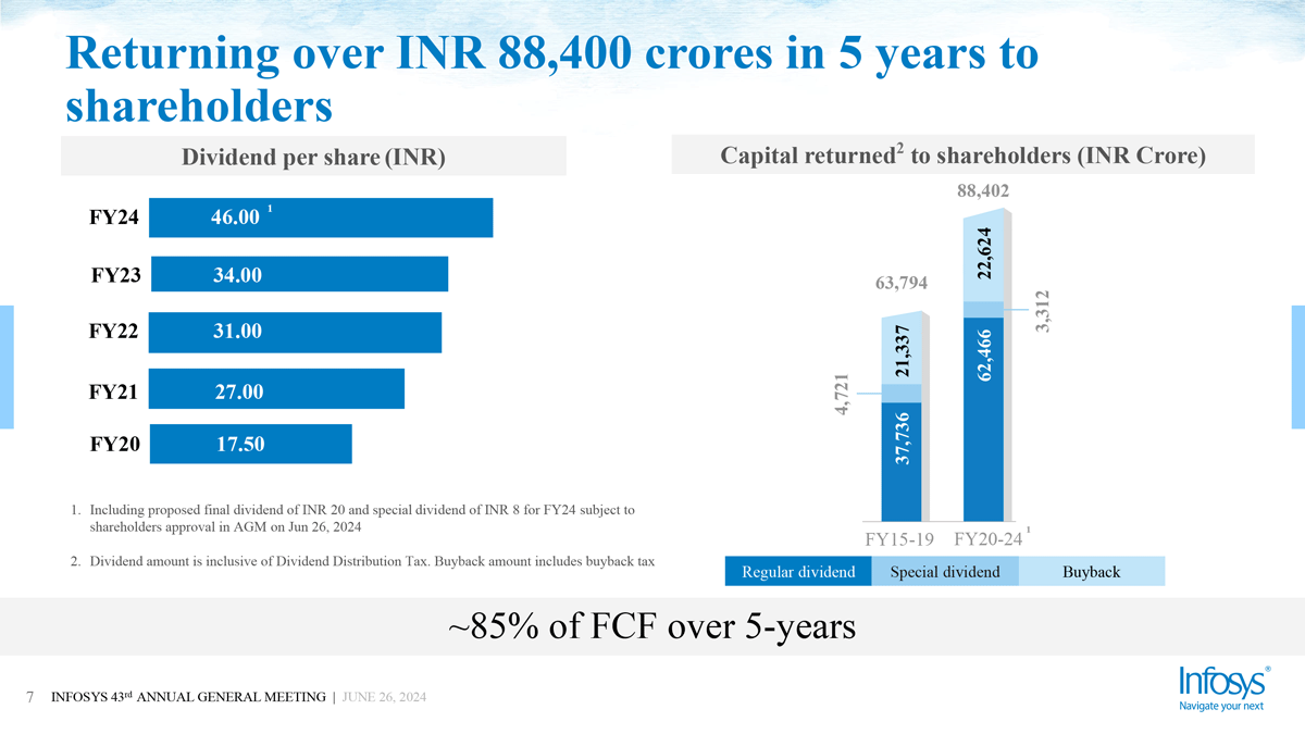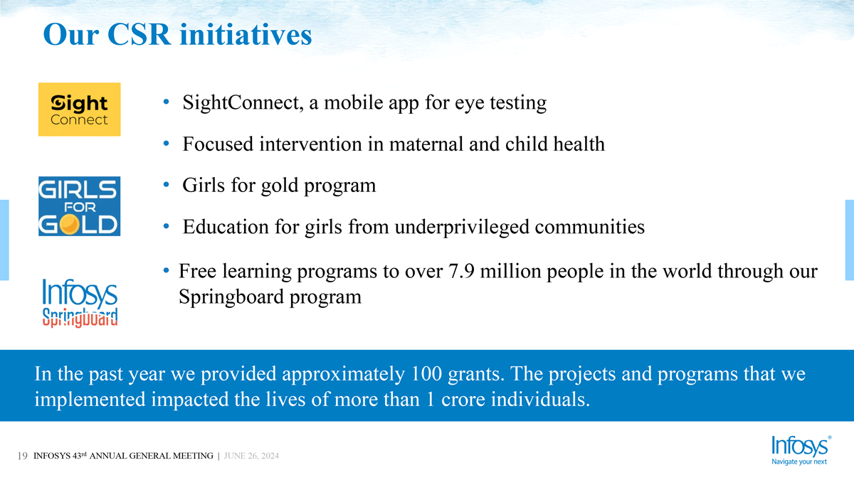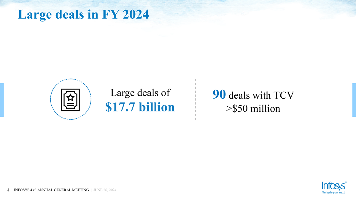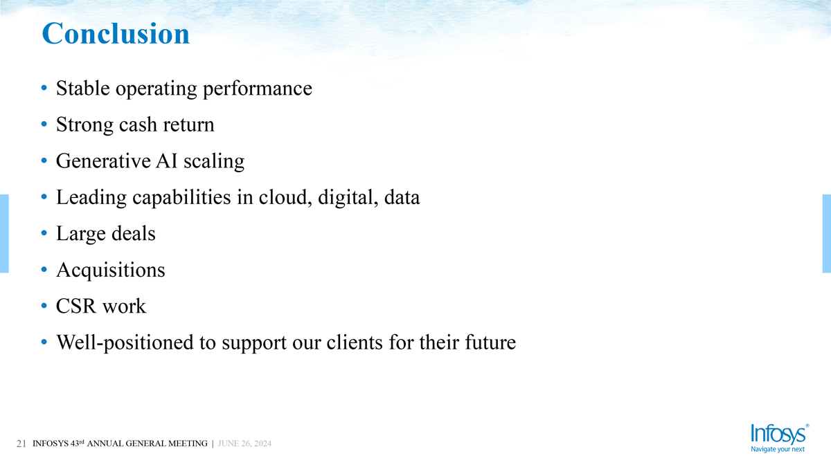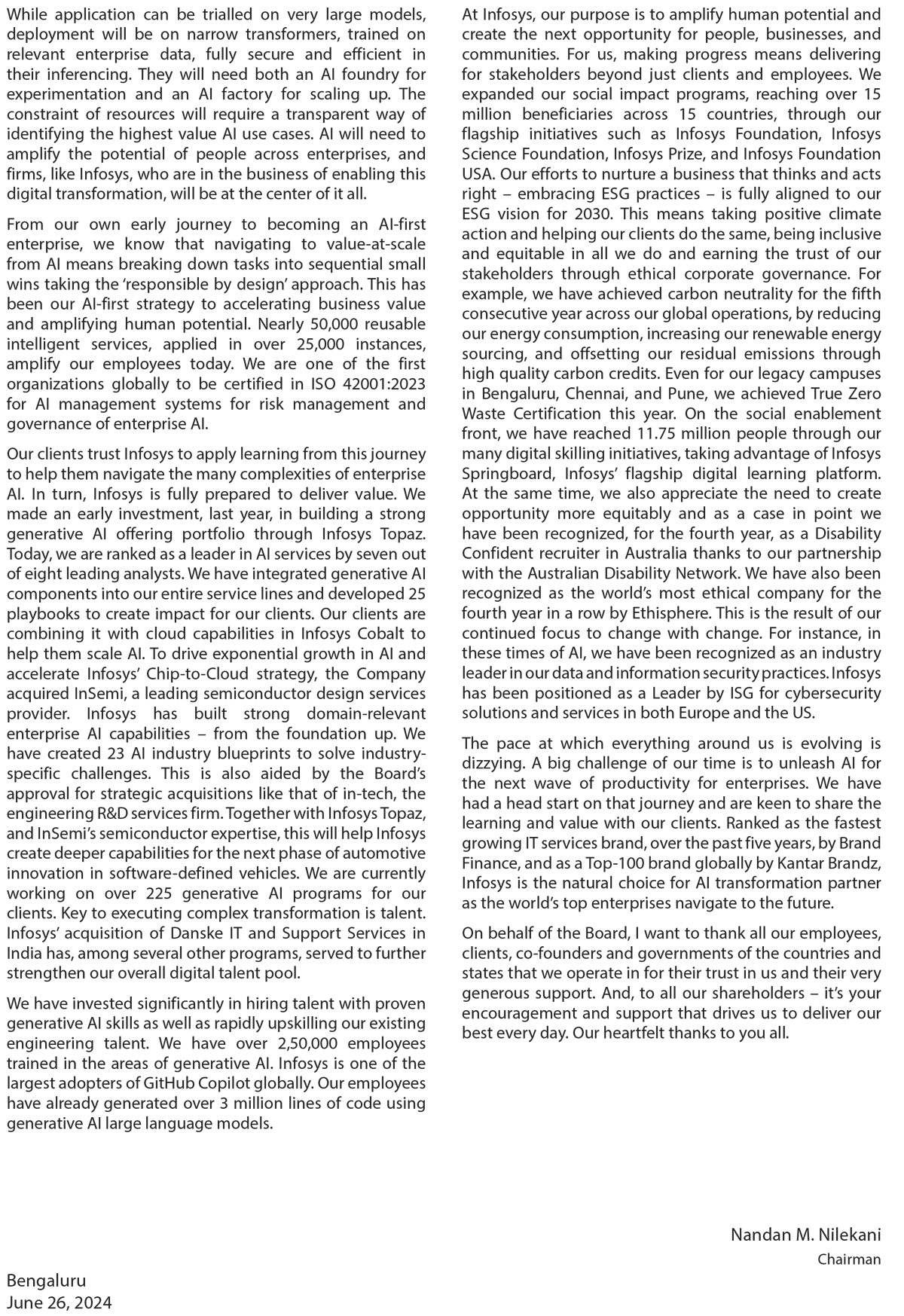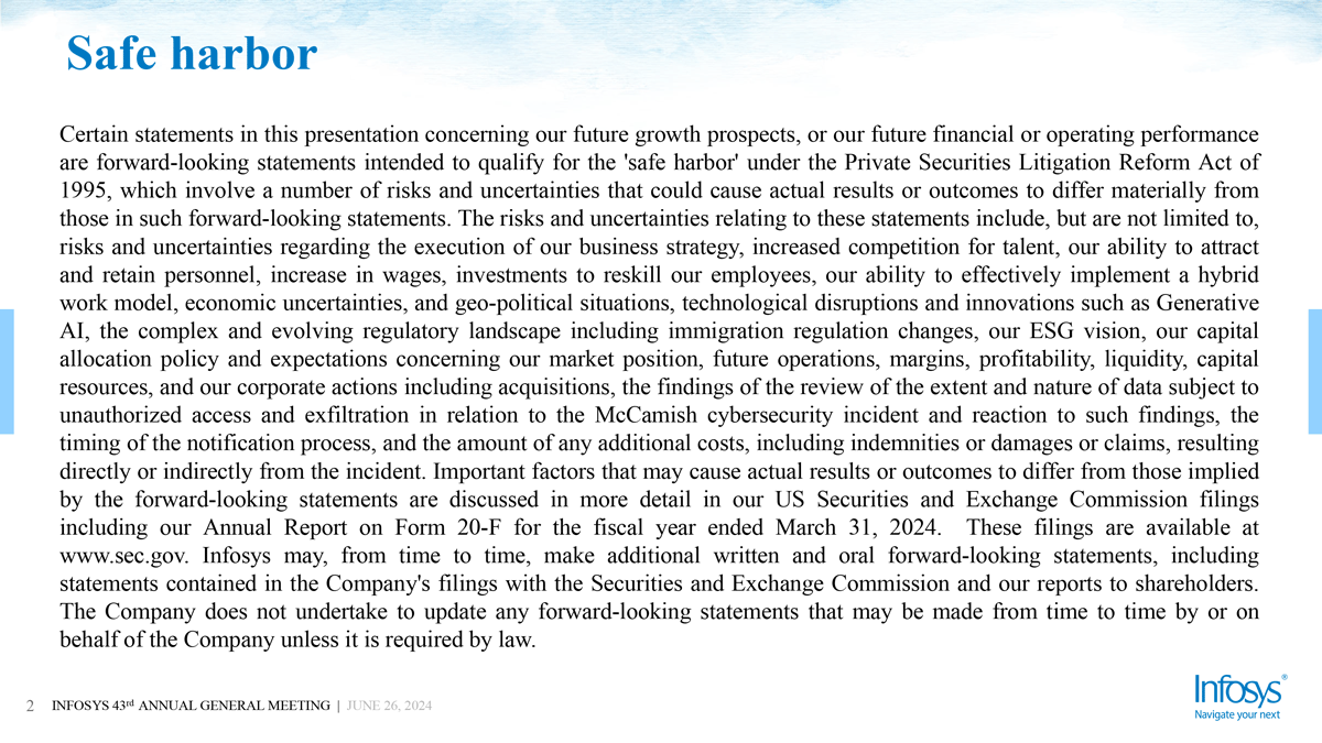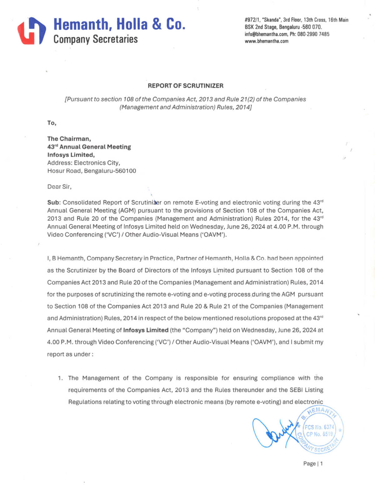 Infosys Limited, a company organized under the laws of the Republic of India ("Infosys", or the "Company"), hereby furnishes with the United States Securities and Exchange Commission this Report on Form 6-K regarding the outcome of the 43rd Annual General Meeting (AGM) of the Company held on June 26, 2024.