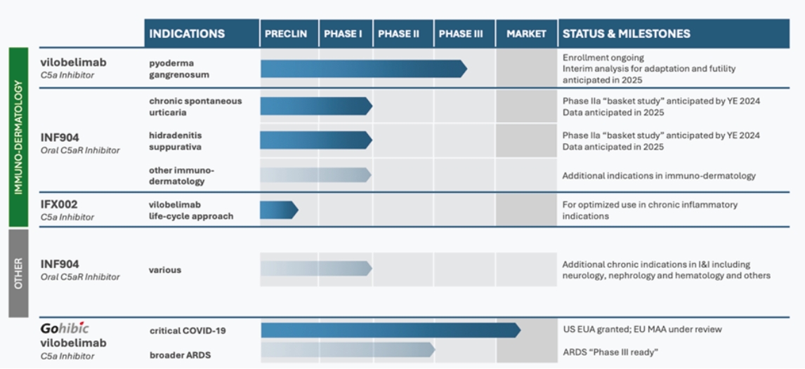 • | the timing, progress and results of preclinical studies and clinical trials of vilobelimab, INF904 and any other product candidates, including for the development of vilobelimab in several indications, including to treat PG, HS (as defined below) and CSU (as defined below) and statements regarding the timing of initiation and completion of studies or trials and related preparatory work, the period during which the results of the trials will become available, the costs of such trials and our research and development programs generally; |