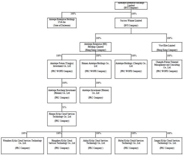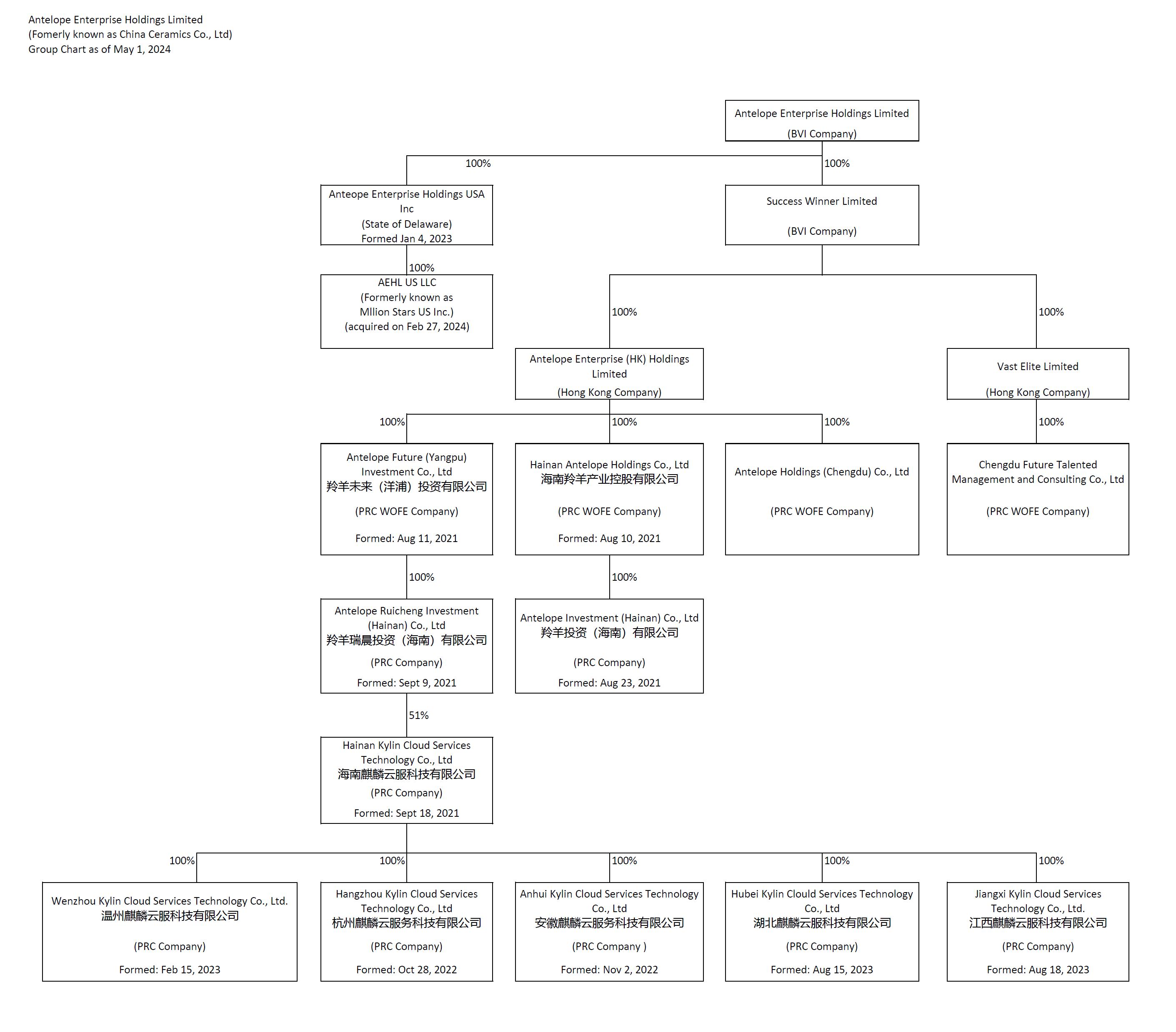 In this prospectus, , “we,” “us,” “our,” “the Company,” and “Antelope Enterprises” refers to Antelope Enterprise Holdings Limited (formerly China Ceramics Co., Ltd.), a British Virgin Islands company, and its subsidiaries, including Success Winner Limited (“Success Winner”), a British Virgin Islands company and wholly owned subsidiary of Antelope Enterprises, Antelope Enterprise Holdings USA Inc. (“Antelope USA”), a Delaware corporation and a wholly owned subsidiary of Antelope Enterprises, Million Stars US Inc. (“Million Stars”), a California corporation and a wholly owned subsidiary of Antelope USA, Vast Elite Limited (“Vast Elite”), a Hong Kong company and wholly owned subsidiary of Success Winner and the entity that wholly owns Chengdu Future Talented Management and Consulting Co., Ltd, (“Chengdu Future”) a PRC operating company, Antelope Enterprise (HK) Holdings Limited (“Antelope HK”), a Hong Kong company and wholly owned subsidiary of Success Winner and the entity that wholly owns Antelope Holdings (Chengdu) Co., Ltd (“Antelope Chengdu”), a PRC operating company, and the entity that wholly owns Antelope Future (Yangpu) Investment Co., Ltd (“Antelope Yangpu”), a PRC operating company that in turn wholly owns Antelope Ruicheng Investment (Hainan) Co., Ltd (“Antelope Ruicheng”) that in turn owns 51% of Hainan Kylin Cloud Services Technology Co., Ltd (“Hainan Kylin”), and the entity that wholly owns Hainan Antelope Holdings Co., Ltd (“Hainan Antelope”), a PRC operating company that in turn wholly owns Antelope Investment (Hainan) Co., Ltd (“Antelope Investment”), Hainan Kylin Cloud Services Technology Co., Ltd (“Hainan Kylin”) that in turrn owns 100% of Hangzhou Kylin Cloud Services Technology Co., Ltd (“Hangzhou Kylin”), Anhui Kylin Cloud Services Technology Co., Ltd (“Anhui Kylin”), WenzhouKylin Cloud Services Technology Co., Ltd. (“Wenzhou Kylin”), Hubei Kylin Cloud Services Technology Co., Ltd. (“Hubei Kylin”), and Jiangxi Kylin Cloud Services Technology Co., Ltd. (“Jiangxi Kylin”).
