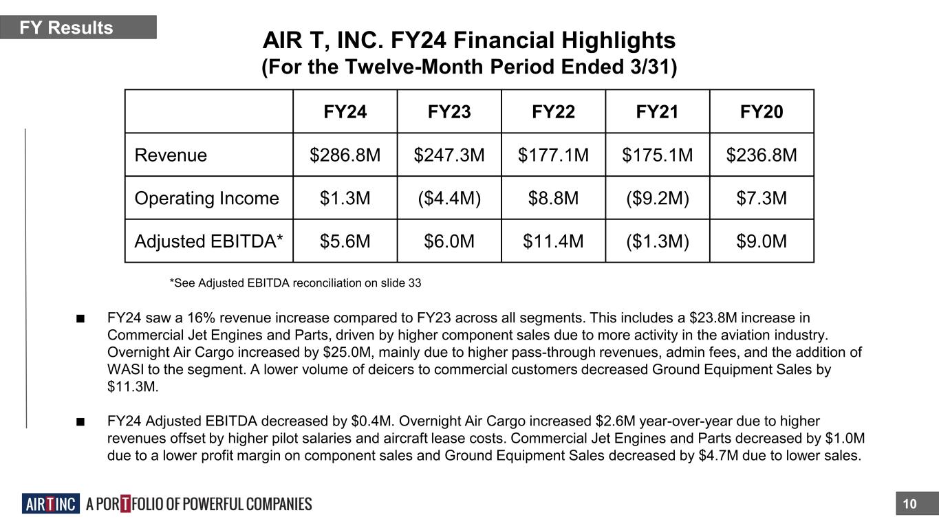 $287M 9 FY24 Revenue $5.6M FY24 Adj. EBITDA* 3 CORE SEGMENTS 14 COMPANIES 624 EMPLOYEES OVERNIGHT AIR CARGO COMMERCIAL JET ENGINES AND PARTS GROUND EQUIPMENT SALES *See Adjusted EBITDA reconciliation on slide 33