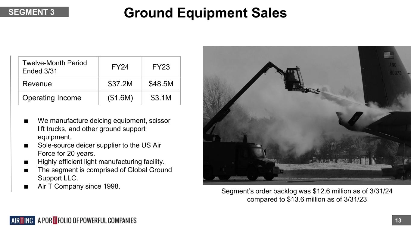 Overnight Air Cargo 12 SEGMENT 2 ■ We operate two of the seven FedEx feeder airlines. ■ Business units Mountain Air Cargo and CSA Air have a 41-year history with FedEx. ■ Air T Companies since 1982, 1983 ■ Air T added Worldwide Aircraft Services (WASI) to this segment in Q4 FY23. ■ Revenues and operating income increased due to an increased fleet and the addition of WASI (see page 19) partially offset by higher pilot salaries and aircraft lease costs. An asset-light, predictable business. Twelve-Month Period Ended 3/31 FY24 FY23 Revenue $115.2M $90.5M Operating Income $6.8M $4.0M