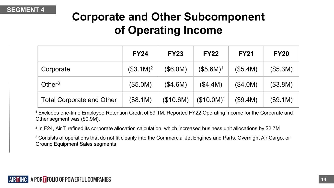 Ground Equipment Sales 13 SEGMENT 3 ■ We manufacture deicing equipment, scissor lift trucks, and other ground support equipment. ■ Sole-source deicer supplier to the US Air Force for 20 years. ■ Highly efficient light manufacturing facility. ■ The segment is comprised of Global Ground Support LLC. ■ Air T Company since 1998. Segment’s order backlog was $12.6 million as of 3/31/24 compared to $13.6 million as of 3/31/23 Twelve-Month Period Ended 3/31 FY24 FY23 Revenue $37.2M $48.5M Operating Income ($1.6M) $3.1M