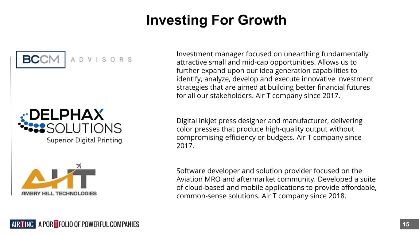 15 Investment manager focused on unearthing fundamentally attractive small and mid-cap opportunities. Allows us to further expand upon our idea generation capabilities to identify, analyze, develop and execute innovative investment strategies that are aimed at building better financial futures for all our stakeholders. Air T company since 2017. Digital inkjet press designer and manufacturer, delivering color presses that produce high-quality output without compromising efficiency or budgets. Air T company since 2017. Software developer and solution provider focused on the Aviation MRO and aftermarket community. Developed a suite of cloud-based and mobile applications to provide affordable, common-sense solutions. Air T company since 2018. Investing For Growth