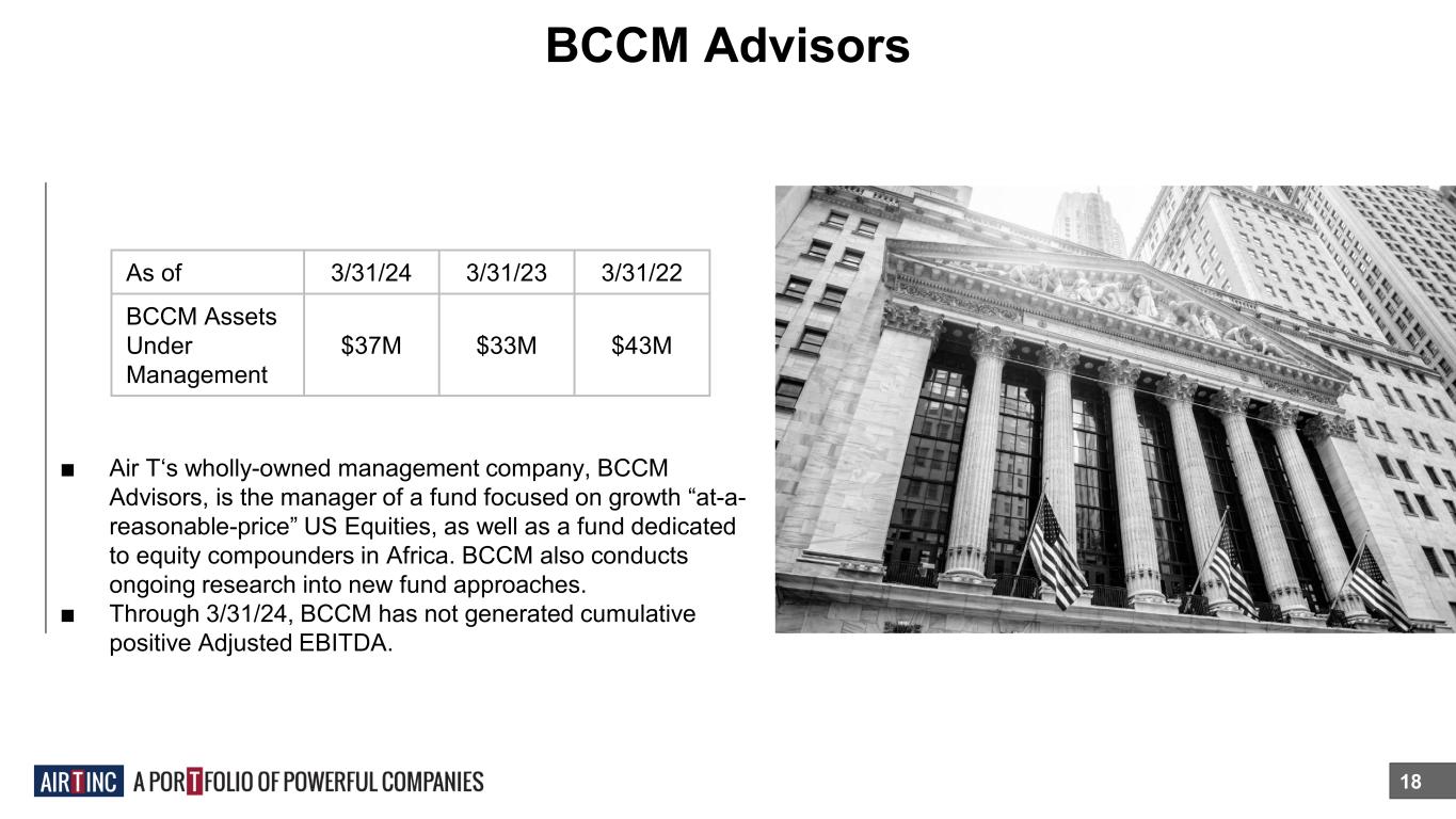 Aircraft JVs 17 ■ We manage assets for ourselves and our investor partners. The asset types include leased aircraft, consignments, and teardowns. ■ Our Aircraft JVs receive standard aviation industry management fees that include an incentive fee of approximately 20% above a hurdle rate of 0% to 8%, depending on the JV. ■ Our Aircraft JV investors seek to generate 10%+ returns after fees. ■ From inception through FY2024, Air T’s aircraft asset management activities have not generated cumulative positive Adjusted EBITDA. Yet this business was Adjusted EBITDA positive in the quarter ended 3/31/2024. As of 3/31/24 3/31/23 3/31/22 Aircraft JV Assets Under Management $429M $150M $84M