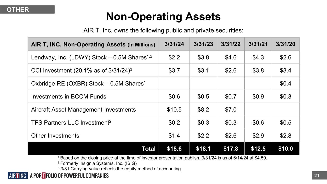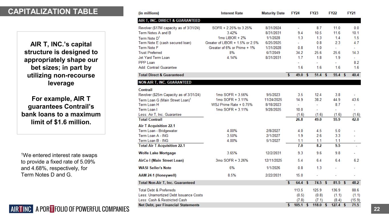 Non-Operating Assets 21 AIR T, Inc. owns the following public and private securities: OTHER AIR T, INC. Non-Operating Assets (In Millions) 3/31/24 3/31/23 3/31/22 3/31/21 3/31/20 Lendway, Inc. (LDWY) Stock – 0.5M Shares1,2 $2.2 $3.8 $4.6 $4.3 $2.6 CCI Investment (20.1% as of 3/31/24)3 $3.7 $3.1 $2.6 $3.8 $3.4 Oxbridge RE (OXBR) Stock – 0.5M Shares1 $0.4 Investments in BCCM Funds $0.6 $0.5 $0.7 $0.9 $0.3 Aircraft Asset Management Investments $10.5 $8.2 $7.0 TFS Partners LLC Investment2 $0.2 $0.3 $0.3 $0.6 $0.5 Other Investments $1.4 $2.2 $2.6 $2.9 $2.8 Total $18.6 $18.1 $17.8 $12.5 $10.0 1 Based on the closing price at the time of investor presentation publish. 3/31/24 is as of 6/14/24 at $4.59. 2 Formerly Insignia Systems, Inc. (ISIG) 3 3/31 Carrying value reflects the equity method of accounting.