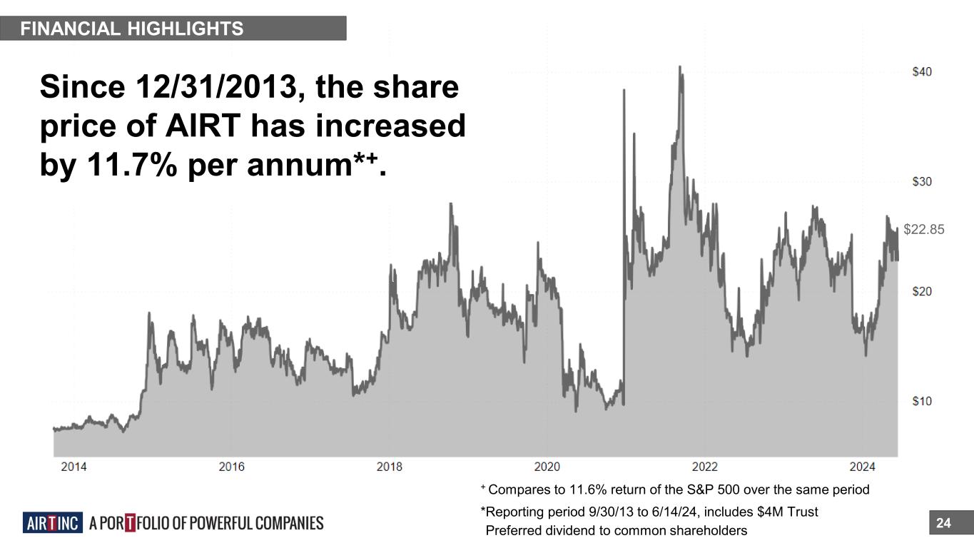 FINANCIAL HIGHLIGHTS 24 Since 12/31/2013, the share price of AIRT has increased by 11.7% per annum*+. *Reporting period 9/30/13 to 6/14/24, includes $4M Trust *Preferred dividend to common shareholders + Compares to 11.6% return of the S&P 500 over the same period $22.85
