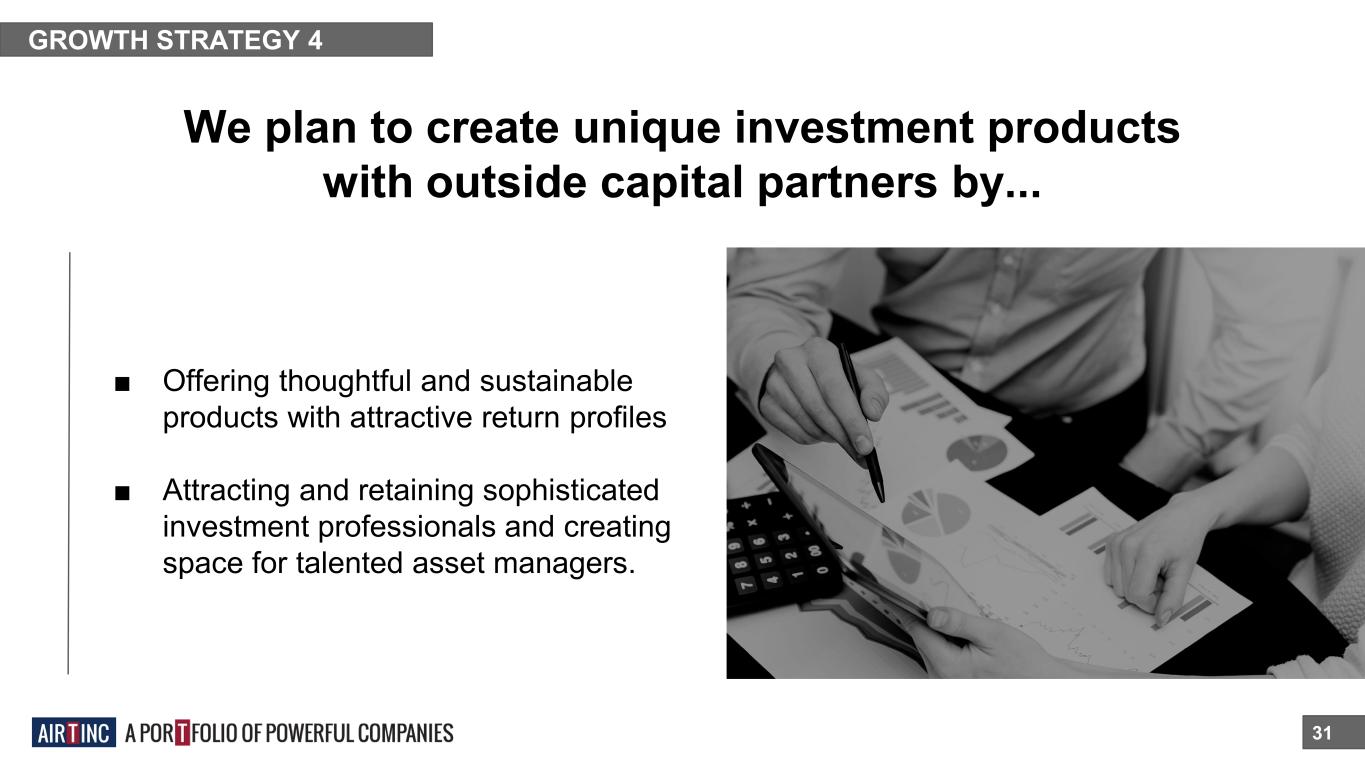 GROWTH STRATEGY 4 We plan to create unique investment products with outside capital partners by... 31 ■ Offering thoughtful and sustainable products with attractive return profiles ■ Attracting and retaining sophisticated investment professionals and creating space for talented asset managers.