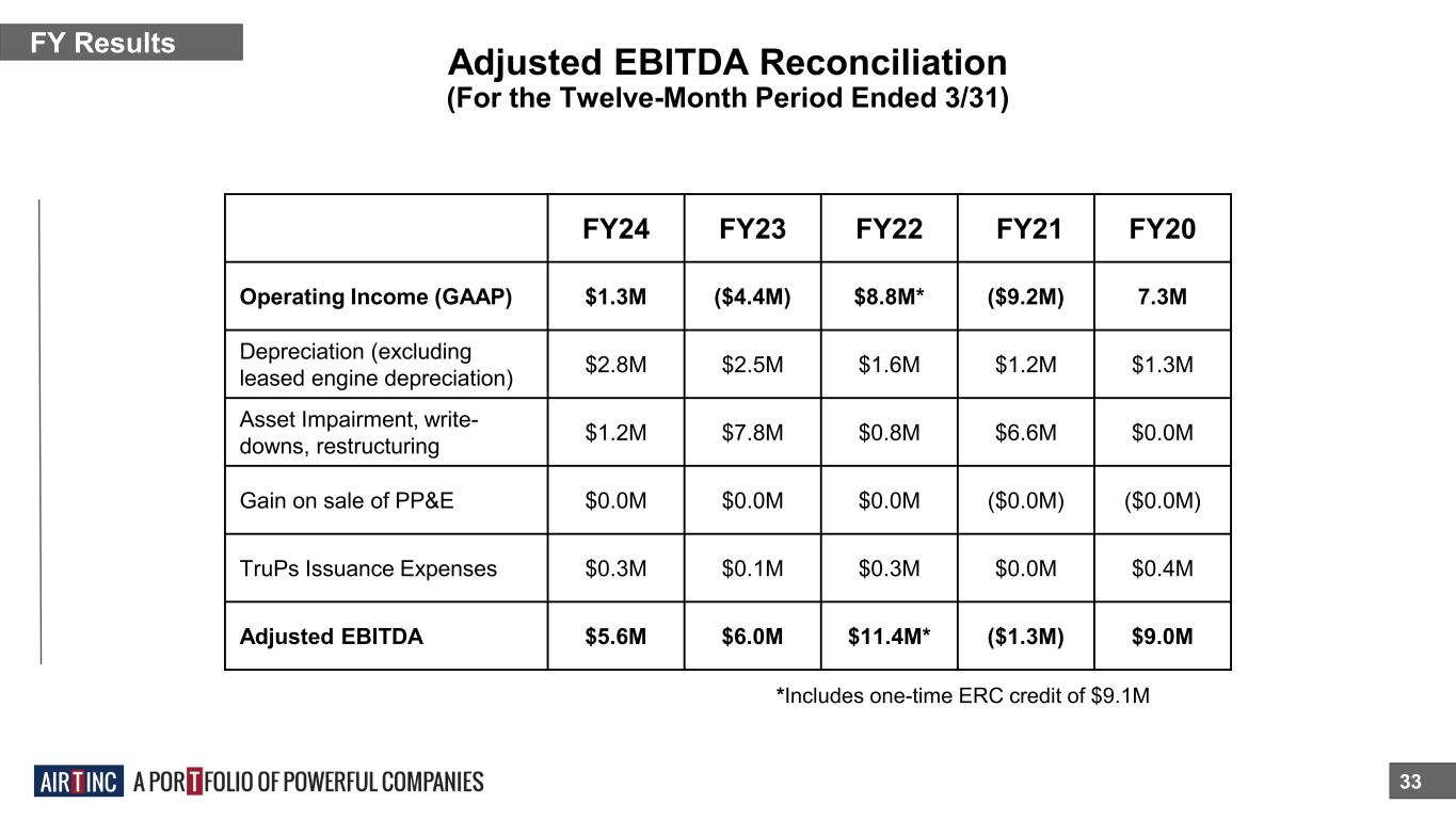 Adjusted EBITDA Reconciliation 33 FY Results FY24 FY23 FY22 FY21 FY20 Operating Income (GAAP) $1.3M ($4.4M) $8.8M* ($9.2M) 7.3M Depreciation (excluding leased engine depreciation) $2.8M $2.5M $1.6M $1.2M $1.3M Asset Impairment, write- downs, restructuring $1.2M $7.8M $0.8M $6.6M $0.0M Gain on sale of PP&E $0.0M $0.0M $0.0M ($0.0M) ($0.0M) TruPs Issuance Expenses $0.3M $0.1M $0.3M $0.0M $0.4M Adjusted EBITDA $5.6M $6.0M $11.4M* ($1.3M) $9.0M *Includes one-time ERC credit of $9.1M (For the Twelve-Month Period Ended 3/31)