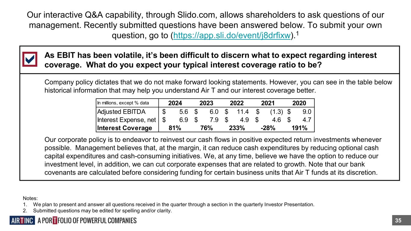 Our interactive Q&A capability, through Slido.com, allows shareholders to ask questions of our management. Recently submitted questions have been answered below. To submit your own question, go to (https://app.sli.do/event/j8drfixw).1 35 As EBIT has been volatile, it’s been difficult to discern what to expect regarding interest coverage. What do you expect your typical interest coverage ratio to be? Company policy dictates that we do not make forward looking statements. However, you can see in the table below historical information that may help you understand Air T and our interest coverage better. Our corporate policy is to endeavor to reinvest our cash flows in positive expected return investments whenever possible. Management believes that, at the margin, it can reduce cash expenditures by reducing optional cash capital expenditures and cash-consuming initiatives. We, at any time, believe we have the option to reduce our investment level, in addition, we can cut corporate expenses that are related to growth. Note that our bank covenants are calculated before considering funding for certain business units that Air T funds at its discretion. Notes: 1. We plan to present and answer all questions received in the quarter through a section in the quarterly Investor Presentation. 2. Submitted questions may be edited for spelling and/or clarity. In millions, except % data 2024 2023 2022 2021 2020 Adjusted EBITDA 5.6$ 6.0$ 11.4$ (1.3)$ 9.0$ Interest Expense, net 6.9$ 7.9$ 4.9$ 4.6$ 4.7$ Interest Coverage 81% 76% 233% -28% 191%