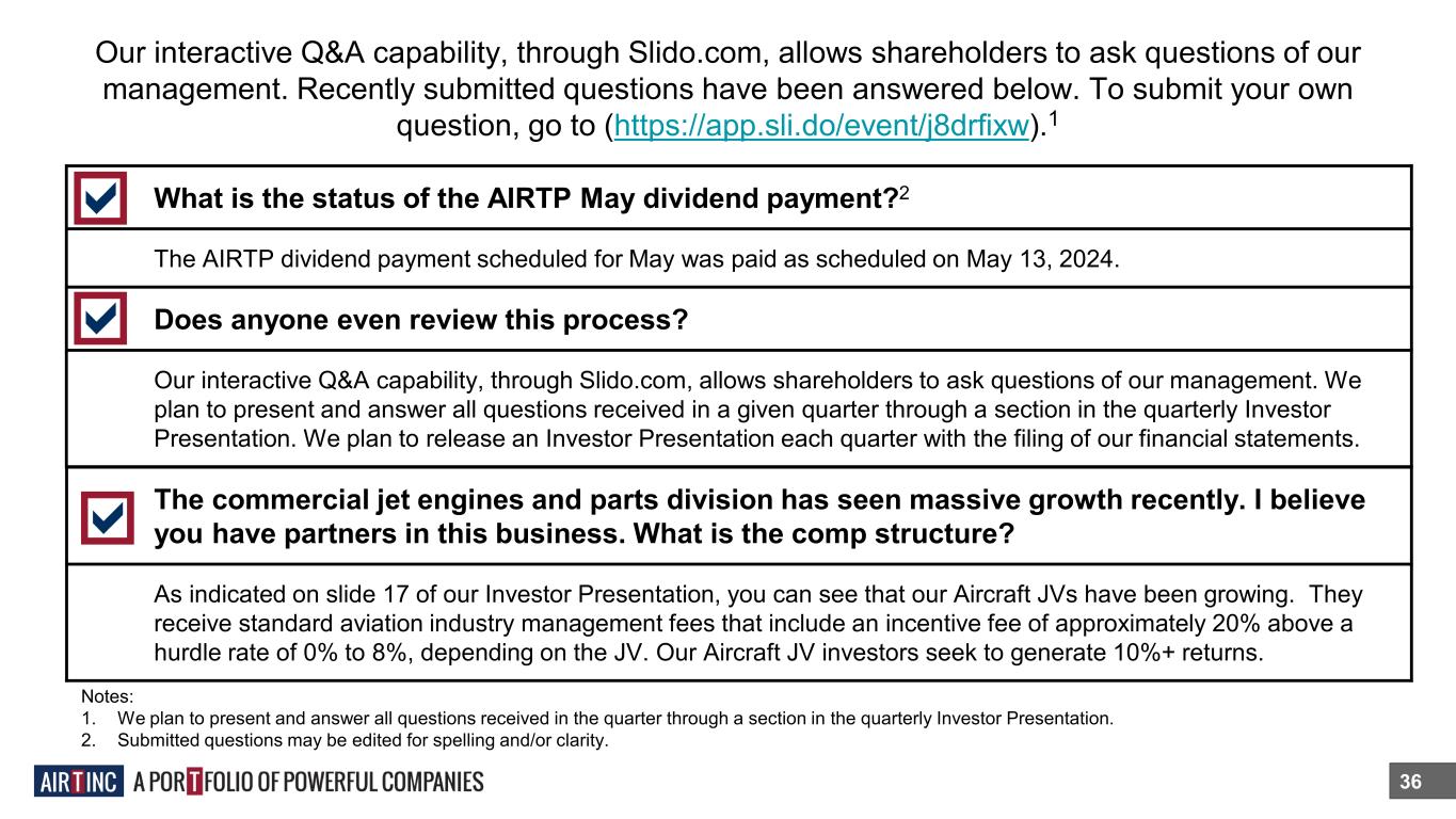 36 Does anyone even review this process? Our interactive Q&A capability, through Slido.com, allows shareholders to ask questions of our management. We plan to present and answer all questions received in a given quarter through a section in the quarterly Investor Presentation. We plan to release an Investor Presentation each quarter with the filing of our financial statements. Our interactive Q&A capability, through Slido.com, allows shareholders to ask questions of our management. Recently submitted questions have been answered below. To submit your own question, go to (https://app.sli.do/event/j8drfixw).1 Notes: 1. We plan to present and answer all questions received in the quarter through a section in the quarterly Investor Presentation. 2. Submitted questions may be edited for spelling and/or clarity. What is the status of the AIRTP May dividend payment?2 The AIRTP dividend payment scheduled for May was paid as scheduled on May 13, 2024. The commercial jet engines and parts division has seen massive growth recently. I believe you have partners in this business. What is the comp structure? As indicated on slide 17 of our Investor Presentation, you can see that our Aircraft JVs have been growing. They receive standard aviation industry management fees that include an incentive fee of approximately 20% above a hurdle rate of 0% to 8%, depending on the JV. Our Aircraft JV investors seek to generate 10%+ returns.