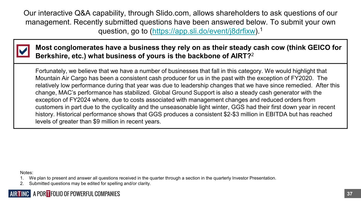 37 Our interactive Q&A capability, through Slido.com, allows shareholders to ask questions of our management. Recently submitted questions have been answered below. To submit your own question, go to (https://app.sli.do/event/j8drfixw).1 Notes: 1. We plan to present and answer all questions received in the quarter through a section in the quarterly Investor Presentation. 2. Submitted questions may be edited for spelling and/or clarity. Most conglomerates have a business they rely on as their steady cash cow (think GEICO for Berkshire, etc.) what business of yours is the backbone of AIRT?2 Fortunately, we believe that we have a number of businesses that fall in this category. We would highlight that Mountain Air Cargo has been a consistent cash producer for us in the past with the exception of FY2020. The relatively low performance during that year was due to leadership changes that we have since remedied. After this change, MAC’s performance has stabilized. Global Ground Support is also a steady cash generator with the exception of FY2024 where, due to costs associated with management changes and reduced orders from customers in part due to the cyclicality and the unseasonable light winter, GGS had their first down year in recent history. Historical performance shows that GGS produces a consistent $2-$3 million in EBITDA but has reached levels of greater than $9 million in recent years.