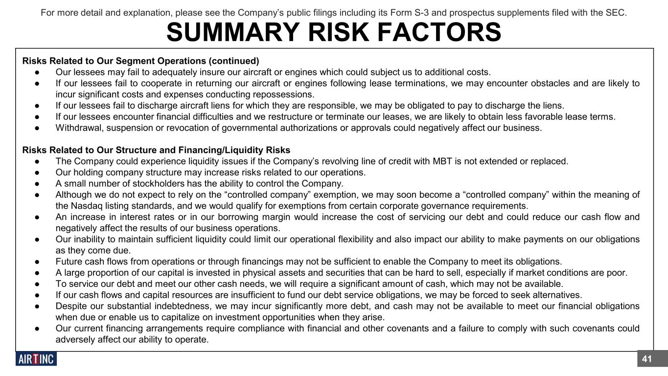 Risks Related to Our Segment Operations ● The operating results of our four segments may fluctuate, particularly our commercial jet engine and parts segment. ● Our Air Cargo Segment is dependent on a significant customer. ● Our dry-lease agreements with FedEx subject us to operating risks. ● Because of our dependence on FedEx, we are subject to the risks that may affect FedEx’s operations. ● A material reduction in the aircraft we fly for FedEx could materially adversely affect our business and results of operations. ● Sales of deicing equipment can be affected by weather conditions. ● We are affected by the risks faced by commercial aircraft operators and MRO companies because they are our customers. ● Our engine values and lease rates, which are dependent on the status of the types of aircraft on which engines are installed, and other factors, could decline. ● Upon termination of a lease, we may be unable to enter into new leases or sell the airframe, engine or its parts on acceptable terms. ● Failures by lessees to meet their maintenance and recordkeeping obligations under our leases could adversely affect the value of our leased engines and aircraft which could affect our ability to re-lease the engines and aircraft in a timely manner following termination of the leases. ● We may experience losses and delays in connection with repossession of engines or aircraft when a lessee defaults. ● Our commercial jet engine and parts segment and its customers operate in a highly regulated industry and changes in laws or regulations may adversely affect our ability to lease or sell our engines or aircraft. ● Our aircraft, engines and parts could cause damage resulting in liability claims. ● We have risks in managing our portfolio of aircraft and engines to meet customer needs. ● Liens on our engines or aircraft could exceed the value of such assets, which could negatively affect our ability to repossess, lease or sell a particular engine or aircraft. ● In certain countries, an engine affixed to an aircraft may become an addition to the aircraft and we may not be able to exercise our ownership rights over the engine. ● Higher or volatile fuel prices could affect the profitability of the aviation industry and our lessees’ ability to meet their lease payment obligations to us. ● Interruptions in the capital markets could impair our lessees’ ability to finance their operations, which could prevent the lessees from complying with payment obligations to us. For more detail and explanation, please see the Company’s public filings including its Form S-3 and prospectus supplements filed with the SEC. SUMMARY RISK FACTORS 40