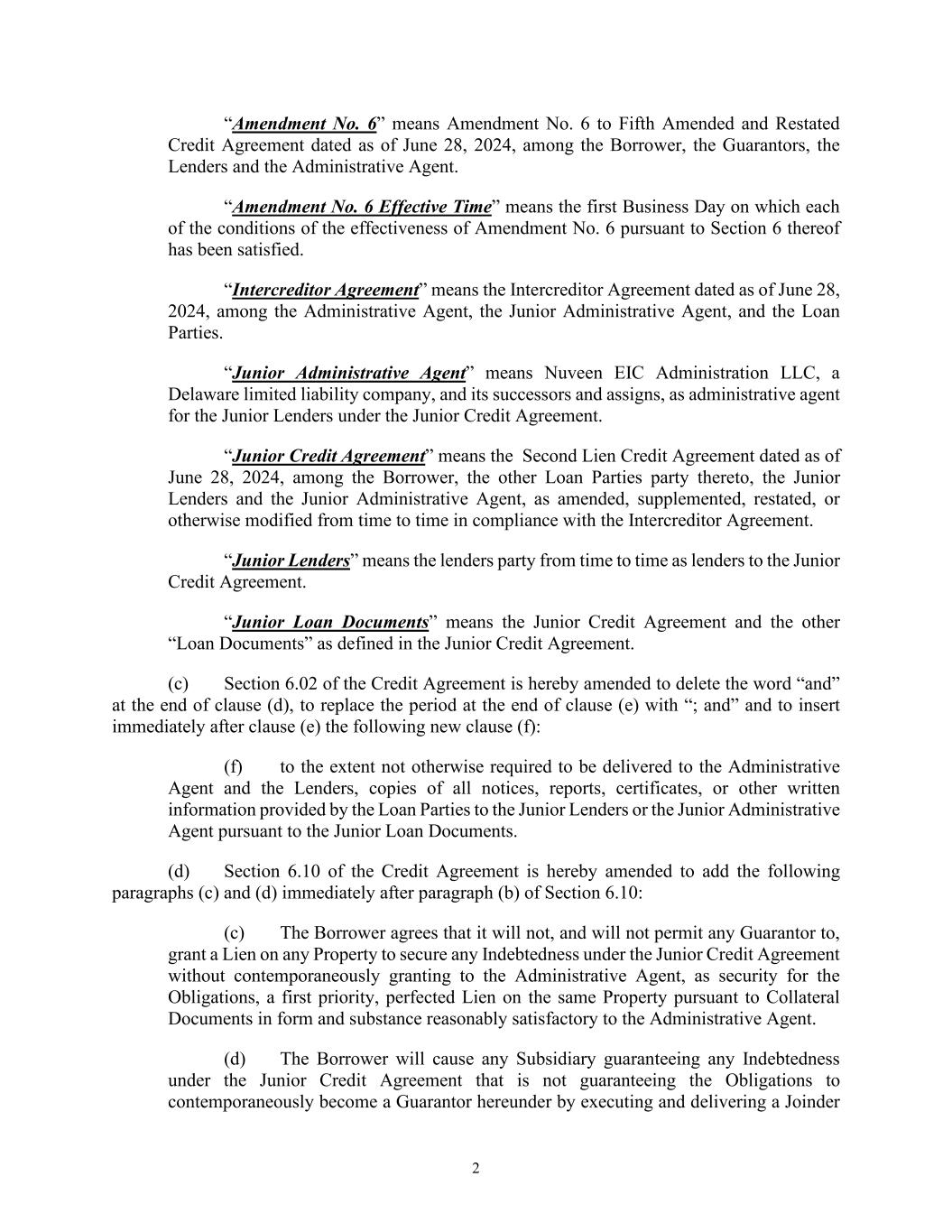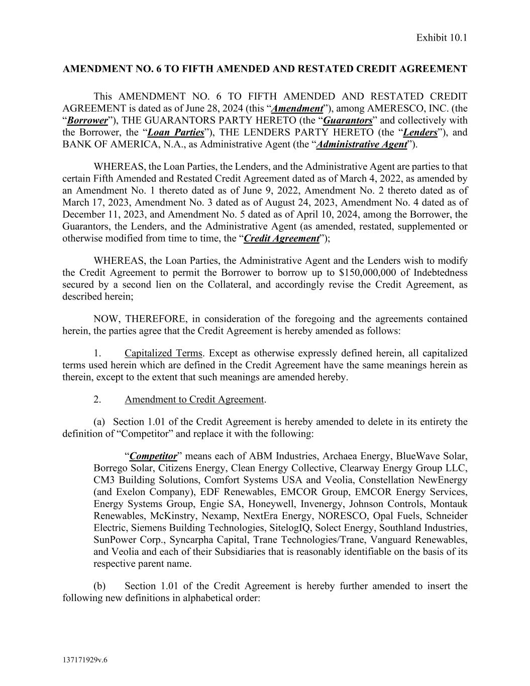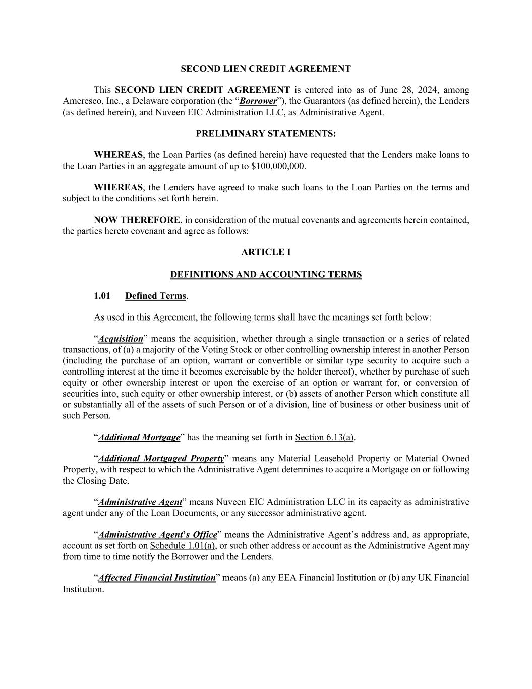 SECOND LIEN CREDIT AGREEMENT This SECOND LIEN CREDIT AGREEMENT is entered into as of June 28, 2024, among Ameresco, Inc., a Delaware corporation (the “Borrower”), the Guarantors (as defined herein), the Lenders (as defined herein), and Nuveen EIC Administration LLC, as Administrative Agent. PRELIMINARY STATEMENTS: WHEREAS, the Loan Parties (as defined herein) have requested that the Lenders make loans to the Loan Parties in an aggregate amount of up to $100,000,000. WHEREAS, the Lenders have agreed to make such loans to the Loan Parties on the terms and subject to the conditions set forth herein. NOW THEREFORE, in consideration of the mutual covenants and agreements herein contained, the parties hereto covenant and agree as follows: ARTICLE I DEFINITIONS AND ACCOUNTING TERMS 1.01 Defined Terms. As used in this Agreement, the following terms shall have the meanings set forth below: “Acquisition” means the acquisition, whether through a single transaction or a series of related transactions, of (a) a majority of the Voting Stock or other controlling ownership interest in another Person (including the purchase of an option, warrant or convertible or similar type security to acquire such a controlling interest at the time it becomes exercisable by the holder thereof), whether by purchase of such equity or other ownership interest or upon the exercise of an option or warrant for, or conversion of securities into, such equity or other ownership interest, or (b) assets of another Person which constitute all or substantially all of the assets of such Person or of a division, line of business or other business unit of such Person. “Additional Mortgage” has the meaning set forth in Section 6.13(a). “Additional Mortgaged Property” means any Material Leasehold Property or Material Owned Property, with respect to which the Administrative Agent determines to acquire a Mortgage on or following the Closing Date. “Administrative Agent” means Nuveen EIC Administration LLC in its capacity as administrative agent under any of the Loan Documents, or any successor administrative agent. “Administrative Agent’s Office” means the Administrative Agent’s address and, as appropriate, account as set forth on Schedule 1.01(a), or such other address or account as the Administrative Agent may from time to time notify the Borrower and the Lenders. “Affected Financial Institution” means (a) any EEA Financial Institution or (b) any UK Financial Institution.