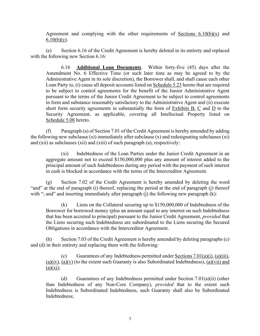 110 or other instruments of ownership will be accepted by it in lieu of any rights with respect to any such liability under this Agreement or any other Loan Document; or (iii) the variation of the terms of such liability in connection with the exercise of the Write-Down and Conversion Powers of the applicable Resolution Authority. 11.21 Acknowledgement Regarding Any Supported QFCs. To the extent that the Loan Documents provide support, through a guarantee or otherwise, for any Swap Contract or any other agreement or instrument that is a QFC (such support, “QFC Credit Support”, and each such QFC, a “Supported QFC”), the parties acknowledge and agree as follows with respect to the resolution power of the Federal Deposit Insurance Corporation under the Federal Deposit Insurance Act and Title II of the Dodd-Frank Wall Street Reform and Consumer Protection Act (together with the regulations promulgated thereunder, the “U.S. Special Resolution Regimes”) in respect of such Supported QFC and QFC Credit Support (with the provisions below applicable notwithstanding that the Loan Documents and any Supported QFC may in fact be stated to be governed by the laws of the State of New York and/or of the United States or any other state of the United States): In the event a Covered Entity that is party to a Supported QFC (each, a “Covered Party”) becomes subject to a proceeding under a U.S. Special Resolution Regime, the transfer of such Supported QFC and the benefit of such QFC Credit Support (and any interest and obligation in or under such Supported QFC and such QFC Credit Support, and any rights in property securing such Supported QFC or such QFC Credit Support) from such Covered Party will be effective to the same extent as the transfer would be effective under the U.S. Special Resolution Regime if the Supported QFC and such QFC Credit Support (and any such interest, obligation and rights in property) were governed by the laws of the United States or a state of the United States. In the event a Covered Party or a BHC Act Affiliate of a Covered Party becomes subject to a proceeding under a U.S. Special Resolution Regime, Default Rights under the Loan Documents that might otherwise apply to such Supported QFC or any QFC Credit Support that may be exercised against such Covered Party are permitted to be exercised to no greater extent than such Default Rights could be exercised under the U.S. Special Resolution Regime if the Supported QFC and the Loan Documents were governed by the laws of the United States or a state of the United States. 11.22 Intercreditor Agreement . Each Lender hereunder (a) acknowledges that it has received a copy of the Intercreditor Agreement, (b) consents to the subordination of Liens provided for in the Intercreditor Agreement, (c) agrees that it will be bound by and will take no actions contrary to the provisions of the Intercreditor Agreement as if it was a signatory thereto and (d) authorizes and instructs the Administrative Agent to enter into the Intercreditor Agreement as Administrative Agent and on behalf of such Lender. The foregoing provisions are intended as an inducement to the First Lien Lenders to permit the incurrence of Indebtedness under this Agreement and to extend credit to the Borrower and such lenders are intended third party beneficiaries of such provisions. In the event of any conflict or inconsistency between the provisions of the Intercreditor Agreement and this Agreement, the provisions of the Intercreditor Agreement shall control. [Remainder of page intentionally left blank]