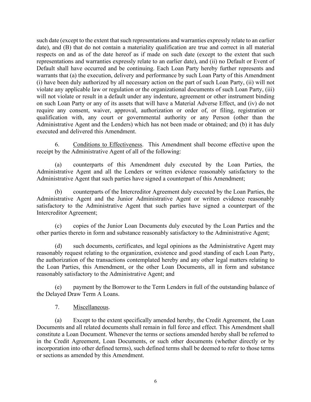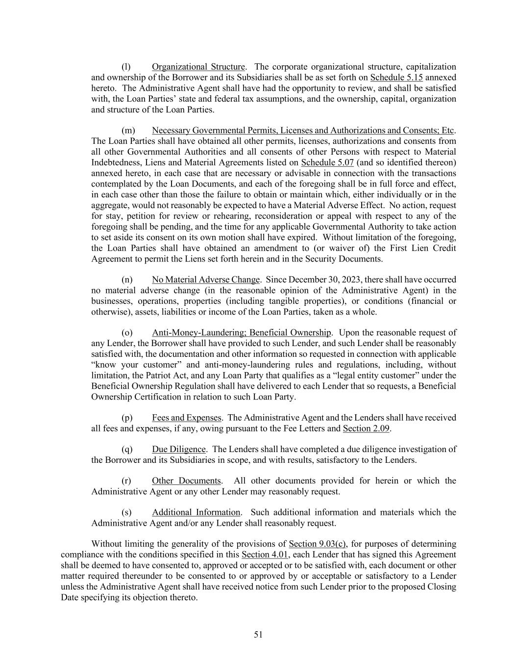 51 (l) Organizational Structure. The corporate organizational structure, capitalization and ownership of the Borrower and its Subsidiaries shall be as set forth on Schedule 5.15 annexed hereto. The Administrative Agent shall have had the opportunity to review, and shall be satisfied with, the Loan Parties’ state and federal tax assumptions, and the ownership, capital, organization and structure of the Loan Parties. (m) Necessary Governmental Permits, Licenses and Authorizations and Consents; Etc. The Loan Parties shall have obtained all other permits, licenses, authorizations and consents from all other Governmental Authorities and all consents of other Persons with respect to Material Indebtedness, Liens and Material Agreements listed on Schedule 5.07 (and so identified thereon) annexed hereto, in each case that are necessary or advisable in connection with the transactions contemplated by the Loan Documents, and each of the foregoing shall be in full force and effect, in each case other than those the failure to obtain or maintain which, either individually or in the aggregate, would not reasonably be expected to have a Material Adverse Effect. No action, request for stay, petition for review or rehearing, reconsideration or appeal with respect to any of the foregoing shall be pending, and the time for any applicable Governmental Authority to take action to set aside its consent on its own motion shall have expired. Without limitation of the foregoing, the Loan Parties shall have obtained an amendment to (or waiver of) the First Lien Credit Agreement to permit the Liens set forth herein and in the Security Documents. (n) No Material Adverse Change. Since December 30, 2023, there shall have occurred no material adverse change (in the reasonable opinion of the Administrative Agent) in the businesses, operations, properties (including tangible properties), or conditions (financial or otherwise), assets, liabilities or income of the Loan Parties, taken as a whole. (o) Anti-Money-Laundering; Beneficial Ownership. Upon the reasonable request of any Lender, the Borrower shall have provided to such Lender, and such Lender shall be reasonably satisfied with, the documentation and other information so requested in connection with applicable “know your customer” and anti-money-laundering rules and regulations, including, without limitation, the Patriot Act, and any Loan Party that qualifies as a “legal entity customer” under the Beneficial Ownership Regulation shall have delivered to each Lender that so requests, a Beneficial Ownership Certification in relation to such Loan Party. (p) Fees and Expenses. The Administrative Agent and the Lenders shall have received all fees and expenses, if any, owing pursuant to the Fee Letters and Section 2.09. (q) Due Diligence. The Lenders shall have completed a due diligence investigation of the Borrower and its Subsidiaries in scope, and with results, satisfactory to the Lenders. (r) Other Documents. All other documents provided for herein or which the Administrative Agent or any other Lender may reasonably request. (s) Additional Information. Such additional information and materials which the Administrative Agent and/or any Lender shall reasonably request. Without limiting the generality of the provisions of Section 9.03(c), for purposes of determining compliance with the conditions specified in this Section 4.01, each Lender that has signed this Agreement shall be deemed to have consented to, approved or accepted or to be satisfied with, each document or other matter required thereunder to be consented to or approved by or acceptable or satisfactory to a Lender unless the Administrative Agent shall have received notice from such Lender prior to the proposed Closing Date specifying its objection thereto.