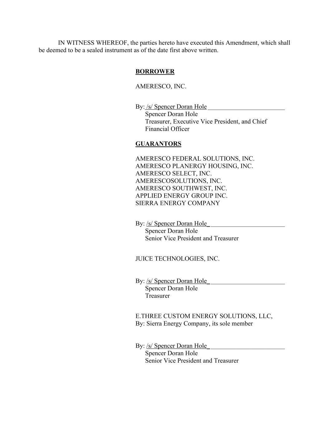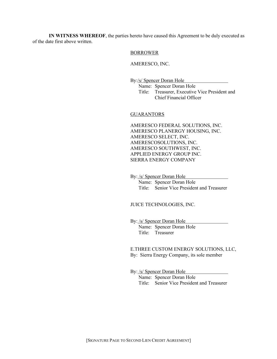 [SIGNATURE PAGE TO SECOND LIEN CREDIT AGREEMENT] IN WITNESS WHEREOF, the parties hereto have caused this Agreement to be duly executed as of the date first above written. BORROWER AMERESCO, INC. By:/s/ Spencer Doran Hole Name: Spencer Doran Hole Title: Treasurer, Executive Vice President and Chief Financial Officer GUARANTORS AMERESCO FEDERAL SOLUTIONS, INC. AMERESCO PLANERGY HOUSING, INC. AMERESCO SELECT, INC. AMERESCOSOLUTIONS, INC. AMERESCO SOUTHWEST, INC. APPLIED ENERGY GROUP INC. SIERRA ENERGY COMPANY By: /s/ Spencer Doran Hole Name: Spencer Doran Hole Title: Senior Vice President and Treasurer JUICE TECHNOLOGIES, INC. By: /s/ Spencer Doran Hole Name: Spencer Doran Hole Title: Treasurer E.THREE CUSTOM ENERGY SOLUTIONS, LLC, By: Sierra Energy Company, its sole member By: /s/ Spencer Doran Hole Name: Spencer Doran Hole Title: Senior Vice President and Treasurer