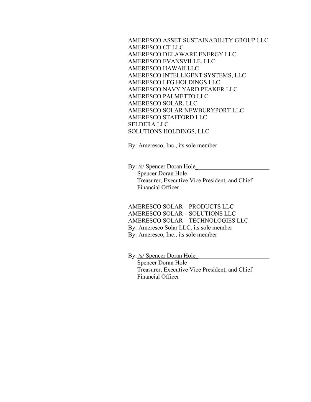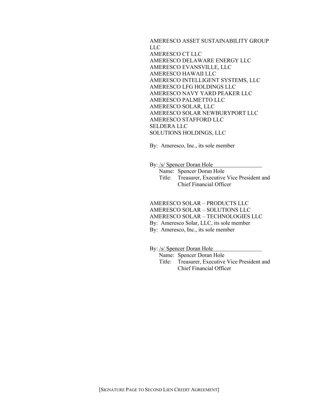 [SIGNATURE PAGE TO SECOND LIEN CREDIT AGREEMENT] AMERESCO ASSET SUSTAINABILITY GROUP LLC AMERESCO CT LLC AMERESCO DELAWARE ENERGY LLC AMERESCO EVANSVILLE, LLC AMERESCO HAWAII LLC AMERESCO INTELLIGENT SYSTEMS, LLC AMERESCO LFG HOLDINGS LLC AMERESCO NAVY YARD PEAKER LLC AMERESCO PALMETTO LLC AMERESCO SOLAR, LLC AMERESCO SOLAR NEWBURYPORT LLC AMERESCO STAFFORD LLC SELDERA LLC SOLUTIONS HOLDINGS, LLC By: Ameresco, Inc., its sole member By: /s/ Spencer Doran Hole Name: Spencer Doran Hole Title: Treasurer, Executive Vice President and Chief Financial Officer AMERESCO SOLAR – PRODUCTS LLC AMERESCO SOLAR – SOLUTIONS LLC AMERESCO SOLAR – TECHNOLOGIES LLC By: Ameresco Solar, LLC, its sole member By: Ameresco, Inc., its sole member By: /s/ Spencer Doran Hole Name: Spencer Doran Hole Title: Treasurer, Executive Vice President and Chief Financial Officer