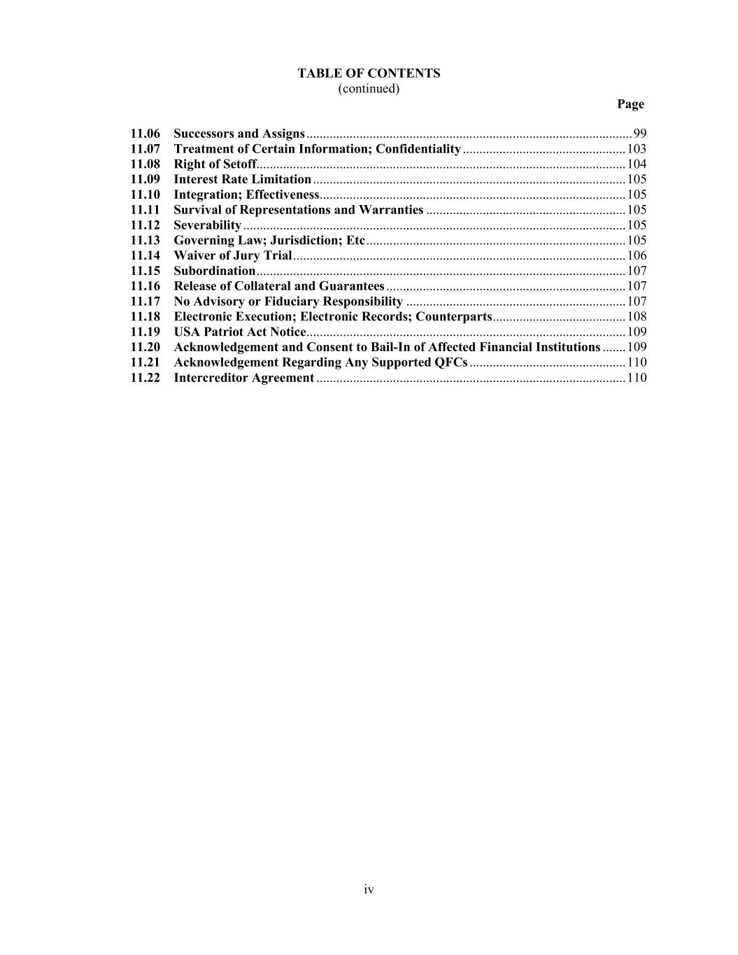 TABLE OF CONTENTS (continued) Page iv 11.06 Successors and Assigns .................................................................................................. 99 11.07 Treatment of Certain Information; Confidentiality ................................................. 103 11.08 Right of Setoff ............................................................................................................... 104 11.09 Interest Rate Limitation .............................................................................................. 105 11.10 Integration; Effectiveness ............................................................................................ 105 11.11 Survival of Representations and Warranties ............................................................ 105 11.12 Severability ................................................................................................................... 105 11.13 Governing Law; Jurisdiction; Etc .............................................................................. 105 11.14 Waiver of Jury Trial .................................................................................................... 106 11.15 Subordination ............................................................................................................... 107 11.16 Release of Collateral and Guarantees ........................................................................ 107 11.17 No Advisory or Fiduciary Responsibility .................................................................. 107 11.18 Electronic Execution; Electronic Records; Counterparts ........................................ 108 11.19 USA Patriot Act Notice ................................................................................................ 109 11.20 Acknowledgement and Consent to Bail-In of Affected Financial Institutions ....... 109 11.21 Acknowledgement Regarding Any Supported QFCs ............................................... 110 11.22 Intercreditor Agreement ............................................................................................. 110