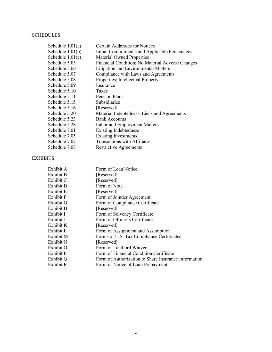 v SCHEDULES Schedule 1.01(a) Certain Addresses for Notices Schedule 1.01(b) Initial Commitments and Applicable Percentages Schedule 1.01(c) Material Owned Properties Schedule 5.05 Financial Condition; No Material Adverse Changes Schedule 5.06 Litigation and Environmental Matters Schedule 5.07 Compliance with Laws and Agreements Schedule 5.08 Properties; Intellectual Property Schedule 5.09 Insurance Schedule 5.10 Taxes Schedule 5.11 Pension Plans Schedule 5.15 Subsidiaries Schedule 5.16 [Reserved] Schedule 5.20 Material Indebtedness, Liens and Agreements Schedule 5.23 Bank Accounts Schedule 5.28 Labor and Employment Matters Schedule 7.01 Existing Indebtedness Schedule 7.05 Existing Investments Schedule 7.07 Transactions with Affiliates Schedule 7.08 Restrictive Agreements EXHIBITS Exhibit A Form of Loan Notice Exhibit B [Reserved] Exhibit C [Reserved] Exhibit D Form of Note Exhibit E [Reserved] Exhibit F Form of Joinder Agreement Exhibit G Form of Compliance Certificate Exhibit H [Reserved] Exhibit I Form of Solvency Certificate Exhibit J Form of Officer’s Certificate Exhibit K [Reserved] Exhibit L Form of Assignment and Assumption Exhibit M Forms of U.S. Tax Compliance Certificates Exhibit N [Reserved] Exhibit O Form of Landlord Waiver Exhibit P Form of Financial Condition Certificate Exhibit Q Form of Authorization to Share Insurance Information Exhibit R Form of Notice of Loan Prepayment