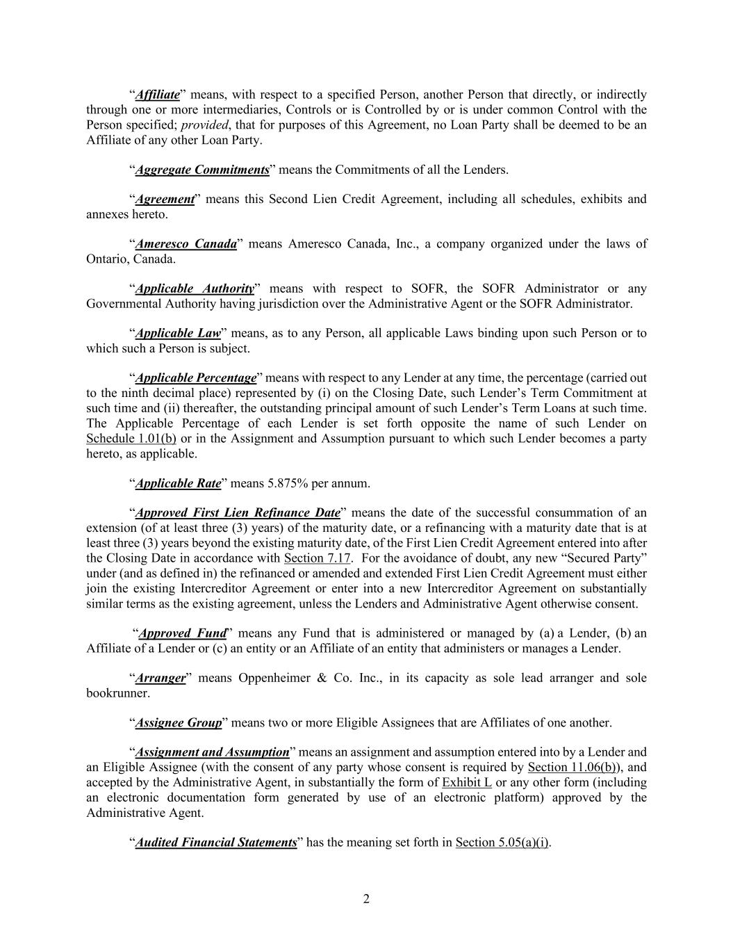 2 “Affiliate” means, with respect to a specified Person, another Person that directly, or indirectly through one or more intermediaries, Controls or is Controlled by or is under common Control with the Person specified; provided, that for purposes of this Agreement, no Loan Party shall be deemed to be an Affiliate of any other Loan Party. “Aggregate Commitments” means the Commitments of all the Lenders. “Agreement” means this Second Lien Credit Agreement, including all schedules, exhibits and annexes hereto. “Ameresco Canada” means Ameresco Canada, Inc., a company organized under the laws of Ontario, Canada. “Applicable Authority” means with respect to SOFR, the SOFR Administrator or any Governmental Authority having jurisdiction over the Administrative Agent or the SOFR Administrator. “Applicable Law” means, as to any Person, all applicable Laws binding upon such Person or to which such a Person is subject. “Applicable Percentage” means with respect to any Lender at any time, the percentage (carried out to the ninth decimal place) represented by (i) on the Closing Date, such Lender’s Term Commitment at such time and (ii) thereafter, the outstanding principal amount of such Lender’s Term Loans at such time. The Applicable Percentage of each Lender is set forth opposite the name of such Lender on Schedule 1.01(b) or in the Assignment and Assumption pursuant to which such Lender becomes a party hereto, as applicable. “Applicable Rate” means 5.875% per annum. “Approved First Lien Refinance Date” means the date of the successful consummation of an extension (of at least three (3) years) of the maturity date, or a refinancing with a maturity date that is at least three (3) years beyond the existing maturity date, of the First Lien Credit Agreement entered into after the Closing Date in accordance with Section 7.17. For the avoidance of doubt, any new “Secured Party” under (and as defined in) the refinanced or amended and extended First Lien Credit Agreement must either join the existing Intercreditor Agreement or enter into a new Intercreditor Agreement on substantially similar terms as the existing agreement, unless the Lenders and Administrative Agent otherwise consent. “Approved Fund” means any Fund that is administered or managed by (a) a Lender, (b) an Affiliate of a Lender or (c) an entity or an Affiliate of an entity that administers or manages a Lender. “Arranger” means Oppenheimer & Co. Inc., in its capacity as sole lead arranger and sole bookrunner. “Assignee Group” means two or more Eligible Assignees that are Affiliates of one another. “Assignment and Assumption” means an assignment and assumption entered into by a Lender and an Eligible Assignee (with the consent of any party whose consent is required by Section 11.06(b)), and accepted by the Administrative Agent, in substantially the form of Exhibit L or any other form (including an electronic documentation form generated by use of an electronic platform) approved by the Administrative Agent. “Audited Financial Statements” has the meaning set forth in Section 5.05(a)(i).