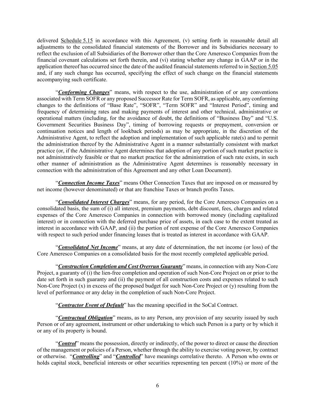 6 delivered Schedule 5.15 in accordance with this Agreement, (v) setting forth in reasonable detail all adjustments to the consolidated financial statements of the Borrower and its Subsidiaries necessary to reflect the exclusion of all Subsidiaries of the Borrower other than the Core Ameresco Companies from the financial covenant calculations set forth therein, and (vi) stating whether any change in GAAP or in the application thereof has occurred since the date of the audited financial statements referred to in Section 5.05 and, if any such change has occurred, specifying the effect of such change on the financial statements accompanying such certificate. “Conforming Changes” means, with respect to the use, administration of or any conventions associated with Term SOFR or any proposed Successor Rate for Term SOFR, as applicable, any conforming changes to the definitions of “Base Rate”, “SOFR”, “Term SOFR” and “Interest Period”, timing and frequency of determining rates and making payments of interest and other technical, administrative or operational matters (including, for the avoidance of doubt, the definitions of “Business Day” and “U.S. Government Securities Business Day”, timing of borrowing requests or prepayment, conversion or continuation notices and length of lookback periods) as may be appropriate, in the discretion of the Administrative Agent, to reflect the adoption and implementation of such applicable rate(s) and to permit the administration thereof by the Administrative Agent in a manner substantially consistent with market practice (or, if the Administrative Agent determines that adoption of any portion of such market practice is not administratively feasible or that no market practice for the administration of such rate exists, in such other manner of administration as the Administrative Agent determines is reasonably necessary in connection with the administration of this Agreement and any other Loan Document). “Connection Income Taxes” means Other Connection Taxes that are imposed on or measured by net income (however denominated) or that are franchise Taxes or branch profits Taxes. “Consolidated Interest Charges” means, for any period, for the Core Ameresco Companies on a consolidated basis, the sum of (i) all interest, premium payments, debt discount, fees, charges and related expenses of the Core Ameresco Companies in connection with borrowed money (including capitalized interest) or in connection with the deferred purchase price of assets, in each case to the extent treated as interest in accordance with GAAP, and (ii) the portion of rent expense of the Core Ameresco Companies with respect to such period under financing leases that is treated as interest in accordance with GAAP. “Consolidated Net Income” means, at any date of determination, the net income (or loss) of the Core Ameresco Companies on a consolidated basis for the most recently completed applicable period. “Construction Completion and Cost Overrun Guaranty” means, in connection with any Non-Core Project, a guaranty of (i) the lien-free completion and operation of such Non-Core Project on or prior to the date set forth in such guaranty and (ii) the payment of all construction costs and expenses related to such Non-Core Project (x) in excess of the proposed budget for such Non-Core Project or (y) resulting from the level of performance or any delay in the completion of such Non-Core Project. “Contractor Event of Default” has the meaning specified in the SoCal Contract. “Contractual Obligation” means, as to any Person, any provision of any security issued by such Person or of any agreement, instrument or other undertaking to which such Person is a party or by which it or any of its property is bound. “Control” means the possession, directly or indirectly, of the power to direct or cause the direction of the management or policies of a Person, whether through the ability to exercise voting power, by contract or otherwise. “Controlling” and “Controlled” have meanings correlative thereto. A Person who owns or holds capital stock, beneficial interests or other securities representing ten percent (10%) or more of the
