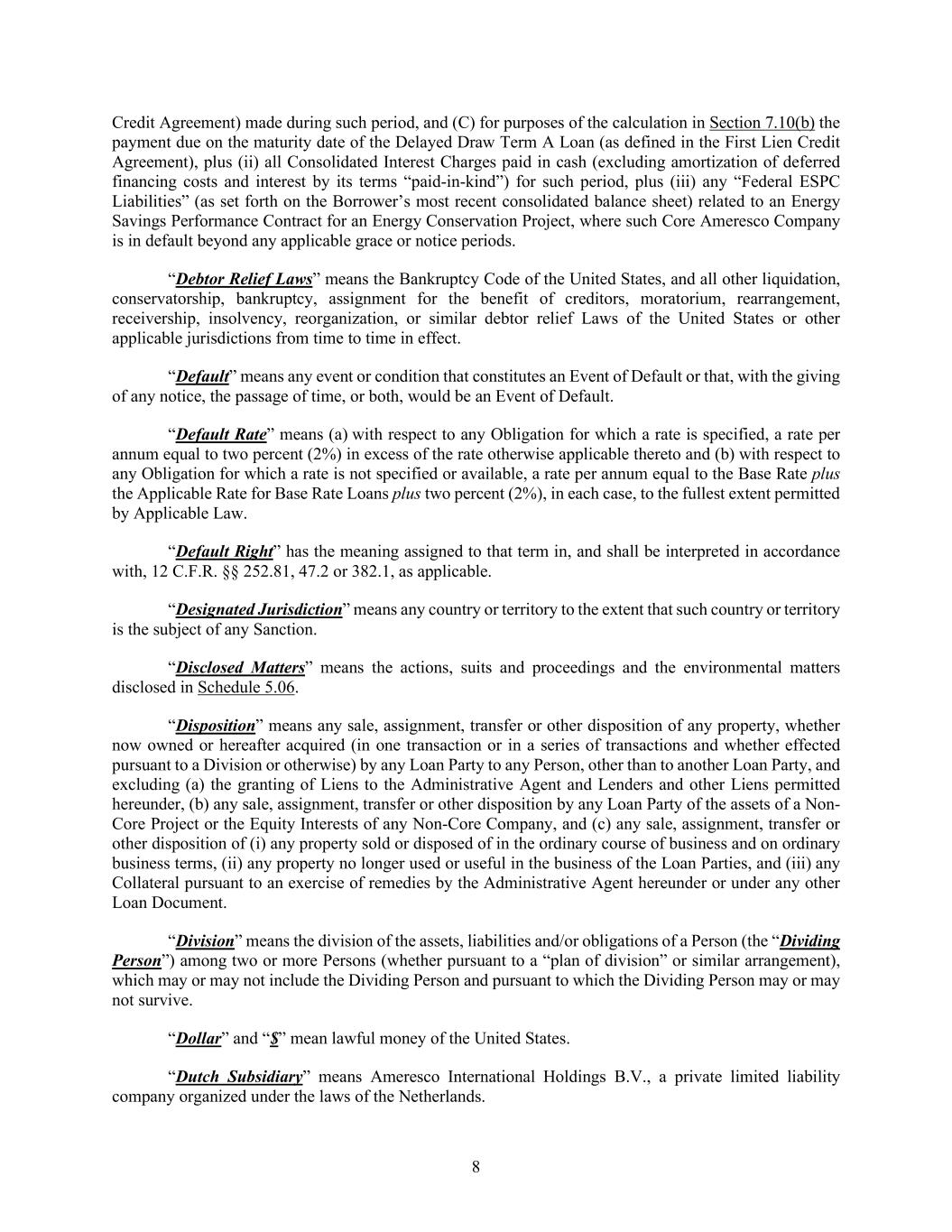 8 Credit Agreement) made during such period, and (C) for purposes of the calculation in Section 7.10(b) the payment due on the maturity date of the Delayed Draw Term A Loan (as defined in the First Lien Credit Agreement), plus (ii) all Consolidated Interest Charges paid in cash (excluding amortization of deferred financing costs and interest by its terms “paid-in-kind”) for such period, plus (iii) any “Federal ESPC Liabilities” (as set forth on the Borrower’s most recent consolidated balance sheet) related to an Energy Savings Performance Contract for an Energy Conservation Project, where such Core Ameresco Company is in default beyond any applicable grace or notice periods. “Debtor Relief Laws” means the Bankruptcy Code of the United States, and all other liquidation, conservatorship, bankruptcy, assignment for the benefit of creditors, moratorium, rearrangement, receivership, insolvency, reorganization, or similar debtor relief Laws of the United States or other applicable jurisdictions from time to time in effect. “Default” means any event or condition that constitutes an Event of Default or that, with the giving of any notice, the passage of time, or both, would be an Event of Default. “Default Rate” means (a) with respect to any Obligation for which a rate is specified, a rate per annum equal to two percent (2%) in excess of the rate otherwise applicable thereto and (b) with respect to any Obligation for which a rate is not specified or available, a rate per annum equal to the Base Rate plus the Applicable Rate for Base Rate Loans plus two percent (2%), in each case, to the fullest extent permitted by Applicable Law. “Default Right” has the meaning assigned to that term in, and shall be interpreted in accordance with, 12 C.F.R. §§ 252.81, 47.2 or 382.1, as applicable. “Designated Jurisdiction” means any country or territory to the extent that such country or territory is the subject of any Sanction. “Disclosed Matters” means the actions, suits and proceedings and the environmental matters disclosed in Schedule 5.06. “Disposition” means any sale, assignment, transfer or other disposition of any property, whether now owned or hereafter acquired (in one transaction or in a series of transactions and whether effected pursuant to a Division or otherwise) by any Loan Party to any Person, other than to another Loan Party, and excluding (a) the granting of Liens to the Administrative Agent and Lenders and other Liens permitted hereunder, (b) any sale, assignment, transfer or other disposition by any Loan Party of the assets of a Non- Core Project or the Equity Interests of any Non-Core Company, and (c) any sale, assignment, transfer or other disposition of (i) any property sold or disposed of in the ordinary course of business and on ordinary business terms, (ii) any property no longer used or useful in the business of the Loan Parties, and (iii) any Collateral pursuant to an exercise of remedies by the Administrative Agent hereunder or under any other Loan Document. “Division” means the division of the assets, liabilities and/or obligations of a Person (the “Dividing Person”) among two or more Persons (whether pursuant to a “plan of division” or similar arrangement), which may or may not include the Dividing Person and pursuant to which the Dividing Person may or may not survive. “Dollar” and “$” mean lawful money of the United States. “Dutch Subsidiary” means Ameresco International Holdings B.V., a private limited liability company organized under the laws of the Netherlands.