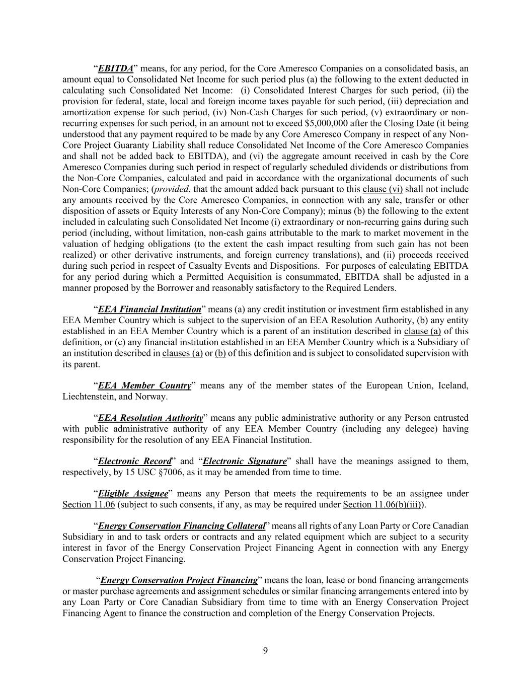9 “EBITDA” means, for any period, for the Core Ameresco Companies on a consolidated basis, an amount equal to Consolidated Net Income for such period plus (a) the following to the extent deducted in calculating such Consolidated Net Income: (i) Consolidated Interest Charges for such period, (ii) the provision for federal, state, local and foreign income taxes payable for such period, (iii) depreciation and amortization expense for such period, (iv) Non-Cash Charges for such period, (v) extraordinary or non- recurring expenses for such period, in an amount not to exceed $5,000,000 after the Closing Date (it being understood that any payment required to be made by any Core Ameresco Company in respect of any Non- Core Project Guaranty Liability shall reduce Consolidated Net Income of the Core Ameresco Companies and shall not be added back to EBITDA), and (vi) the aggregate amount received in cash by the Core Ameresco Companies during such period in respect of regularly scheduled dividends or distributions from the Non-Core Companies, calculated and paid in accordance with the organizational documents of such Non-Core Companies; (provided, that the amount added back pursuant to this clause (vi) shall not include any amounts received by the Core Ameresco Companies, in connection with any sale, transfer or other disposition of assets or Equity Interests of any Non-Core Company); minus (b) the following to the extent included in calculating such Consolidated Net Income (i) extraordinary or non-recurring gains during such period (including, without limitation, non-cash gains attributable to the mark to market movement in the valuation of hedging obligations (to the extent the cash impact resulting from such gain has not been realized) or other derivative instruments, and foreign currency translations), and (ii) proceeds received during such period in respect of Casualty Events and Dispositions. For purposes of calculating EBITDA for any period during which a Permitted Acquisition is consummated, EBITDA shall be adjusted in a manner proposed by the Borrower and reasonably satisfactory to the Required Lenders. “EEA Financial Institution” means (a) any credit institution or investment firm established in any EEA Member Country which is subject to the supervision of an EEA Resolution Authority, (b) any entity established in an EEA Member Country which is a parent of an institution described in clause (a) of this definition, or (c) any financial institution established in an EEA Member Country which is a Subsidiary of an institution described in clauses (a) or (b) of this definition and is subject to consolidated supervision with its parent. “EEA Member Country” means any of the member states of the European Union, Iceland, Liechtenstein, and Norway. “EEA Resolution Authority” means any public administrative authority or any Person entrusted with public administrative authority of any EEA Member Country (including any delegee) having responsibility for the resolution of any EEA Financial Institution. “Electronic Record” and “Electronic Signature” shall have the meanings assigned to them, respectively, by 15 USC §7006, as it may be amended from time to time. “Eligible Assignee” means any Person that meets the requirements to be an assignee under Section 11.06 (subject to such consents, if any, as may be required under Section 11.06(b)(iii)). “Energy Conservation Financing Collateral” means all rights of any Loan Party or Core Canadian Subsidiary in and to task orders or contracts and any related equipment which are subject to a security interest in favor of the Energy Conservation Project Financing Agent in connection with any Energy Conservation Project Financing. “Energy Conservation Project Financing” means the loan, lease or bond financing arrangements or master purchase agreements and assignment schedules or similar financing arrangements entered into by any Loan Party or Core Canadian Subsidiary from time to time with an Energy Conservation Project Financing Agent to finance the construction and completion of the Energy Conservation Projects.