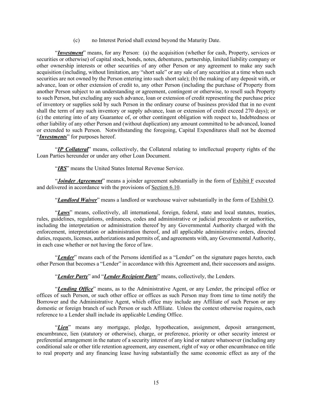 15 (c) no Interest Period shall extend beyond the Maturity Date. “Investment” means, for any Person: (a) the acquisition (whether for cash, Property, services or securities or otherwise) of capital stock, bonds, notes, debentures, partnership, limited liability company or other ownership interests or other securities of any other Person or any agreement to make any such acquisition (including, without limitation, any “short sale” or any sale of any securities at a time when such securities are not owned by the Person entering into such short sale); (b) the making of any deposit with, or advance, loan or other extension of credit to, any other Person (including the purchase of Property from another Person subject to an understanding or agreement, contingent or otherwise, to resell such Property to such Person, but excluding any such advance, loan or extension of credit representing the purchase price of inventory or supplies sold by such Person in the ordinary course of business provided that in no event shall the term of any such inventory or supply advance, loan or extension of credit exceed 270 days); or (c) the entering into of any Guarantee of, or other contingent obligation with respect to, Indebtedness or other liability of any other Person and (without duplication) any amount committed to be advanced, loaned or extended to such Person. Notwithstanding the foregoing, Capital Expenditures shall not be deemed “Investments” for purposes hereof. “IP Collateral” means, collectively, the Collateral relating to intellectual property rights of the Loan Parties hereunder or under any other Loan Document. “IRS” means the United States Internal Revenue Service. “Joinder Agreement” means a joinder agreement substantially in the form of Exhibit F executed and delivered in accordance with the provisions of Section 6.10. “Landlord Waiver” means a landlord or warehouse waiver substantially in the form of Exhibit O. “Laws” means, collectively, all international, foreign, federal, state and local statutes, treaties, rules, guidelines, regulations, ordinances, codes and administrative or judicial precedents or authorities, including the interpretation or administration thereof by any Governmental Authority charged with the enforcement, interpretation or administration thereof, and all applicable administrative orders, directed duties, requests, licenses, authorizations and permits of, and agreements with, any Governmental Authority, in each case whether or not having the force of law. “Lender” means each of the Persons identified as a “Lender” on the signature pages hereto, each other Person that becomes a “Lender” in accordance with this Agreement and, their successors and assigns. “Lender Party” and “Lender Recipient Party” means, collectively, the Lenders. “Lending Office” means, as to the Administrative Agent, or any Lender, the principal office or offices of such Person, or such other office or offices as such Person may from time to time notify the Borrower and the Administrative Agent, which office may include any Affiliate of such Person or any domestic or foreign branch of such Person or such Affiliate. Unless the context otherwise requires, each reference to a Lender shall include its applicable Lending Office. “Lien” means any mortgage, pledge, hypothecation, assignment, deposit arrangement, encumbrance, lien (statutory or otherwise), charge, or preference, priority or other security interest or preferential arrangement in the nature of a security interest of any kind or nature whatsoever (including any conditional sale or other title retention agreement, any easement, right of way or other encumbrance on title to real property and any financing lease having substantially the same economic effect as any of the