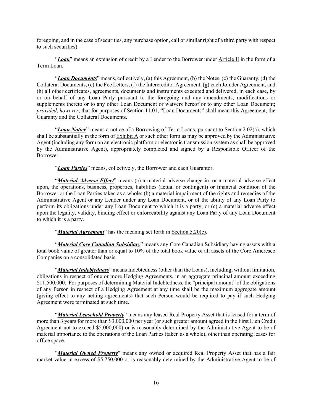 16 foregoing, and in the case of securities, any purchase option, call or similar right of a third party with respect to such securities). “Loan” means an extension of credit by a Lender to the Borrower under Article II in the form of a Term Loan. “Loan Documents” means, collectively, (a) this Agreement, (b) the Notes, (c) the Guaranty, (d) the Collateral Documents, (e) the Fee Letters, (f) the Intercreditor Agreement, (g) each Joinder Agreement, and (h) all other certificates, agreements, documents and instruments executed and delivered, in each case, by or on behalf of any Loan Party pursuant to the foregoing and any amendments, modifications or supplements thereto or to any other Loan Document or waivers hereof or to any other Loan Document; provided, however, that for purposes of Section 11.01, “Loan Documents” shall mean this Agreement, the Guaranty and the Collateral Documents. “Loan Notice” means a notice of a Borrowing of Term Loans, pursuant to Section 2.02(a), which shall be substantially in the form of Exhibit A or such other form as may be approved by the Administrative Agent (including any form on an electronic platform or electronic transmission system as shall be approved by the Administrative Agent), appropriately completed and signed by a Responsible Officer of the Borrower. “Loan Parties” means, collectively, the Borrower and each Guarantor. “Material Adverse Effect” means (a) a material adverse change in, or a material adverse effect upon, the operations, business, properties, liabilities (actual or contingent) or financial condition of the Borrower or the Loan Parties taken as a whole; (b) a material impairment of the rights and remedies of the Administrative Agent or any Lender under any Loan Document, or of the ability of any Loan Party to perform its obligations under any Loan Document to which it is a party; or (c) a material adverse effect upon the legality, validity, binding effect or enforceability against any Loan Party of any Loan Document to which it is a party. “Material Agreement” has the meaning set forth in Section 5.20(c). “Material Core Canadian Subsidiary” means any Core Canadian Subsidiary having assets with a total book value of greater than or equal to 10% of the total book value of all assets of the Core Ameresco Companies on a consolidated basis. “Material Indebtedness” means Indebtedness (other than the Loans), including, without limitation, obligations in respect of one or more Hedging Agreements, in an aggregate principal amount exceeding $11,500,000. For purposes of determining Material Indebtedness, the “principal amount” of the obligations of any Person in respect of a Hedging Agreement at any time shall be the maximum aggregate amount (giving effect to any netting agreements) that such Person would be required to pay if such Hedging Agreement were terminated at such time. “Material Leasehold Property” means any leased Real Property Asset that is leased for a term of more than 3 years for more than $3,000,000 per year (or such greater amount agreed in the First Lien Credit Agreement not to exceed $5,000,000) or is reasonably determined by the Administrative Agent to be of material importance to the operations of the Loan Parties (taken as a whole), other than operating leases for office space. “Material Owned Property” means any owned or acquired Real Property Asset that has a fair market value in excess of $5,750,000 or is reasonably determined by the Administrative Agent to be of