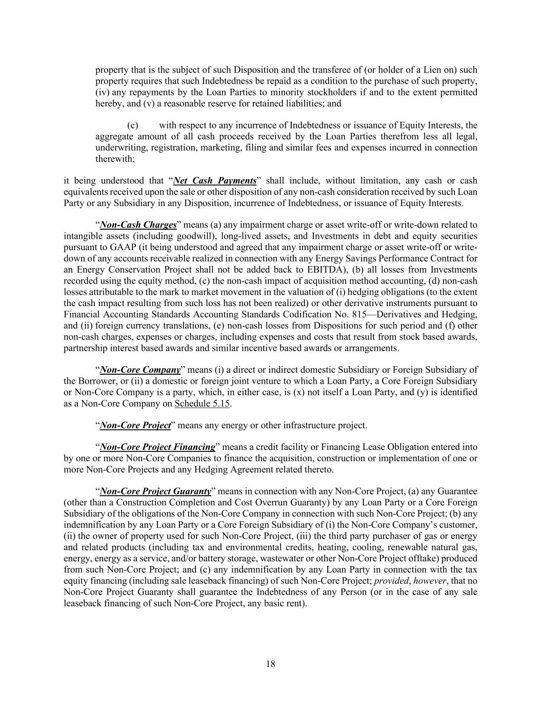 18 property that is the subject of such Disposition and the transferee of (or holder of a Lien on) such property requires that such Indebtedness be repaid as a condition to the purchase of such property, (iv) any repayments by the Loan Parties to minority stockholders if and to the extent permitted hereby, and (v) a reasonable reserve for retained liabilities; and (c) with respect to any incurrence of Indebtedness or issuance of Equity Interests, the aggregate amount of all cash proceeds received by the Loan Parties therefrom less all legal, underwriting, registration, marketing, filing and similar fees and expenses incurred in connection therewith; it being understood that “Net Cash Payments” shall include, without limitation, any cash or cash equivalents received upon the sale or other disposition of any non-cash consideration received by such Loan Party or any Subsidiary in any Disposition, incurrence of Indebtedness, or issuance of Equity Interests. “Non-Cash Charges” means (a) any impairment charge or asset write-off or write-down related to intangible assets (including goodwill), long-lived assets, and Investments in debt and equity securities pursuant to GAAP (it being understood and agreed that any impairment charge or asset write-off or write- down of any accounts receivable realized in connection with any Energy Savings Performance Contract for an Energy Conservation Project shall not be added back to EBITDA), (b) all losses from Investments recorded using the equity method, (c) the non-cash impact of acquisition method accounting, (d) non-cash losses attributable to the mark to market movement in the valuation of (i) hedging obligations (to the extent the cash impact resulting from such loss has not been realized) or other derivative instruments pursuant to Financial Accounting Standards Accounting Standards Codification No. 815—Derivatives and Hedging, and (ii) foreign currency translations, (e) non-cash losses from Dispositions for such period and (f) other non-cash charges, expenses or charges, including expenses and costs that result from stock based awards, partnership interest based awards and similar incentive based awards or arrangements. “Non-Core Company” means (i) a direct or indirect domestic Subsidiary or Foreign Subsidiary of the Borrower, or (ii) a domestic or foreign joint venture to which a Loan Party, a Core Foreign Subsidiary or Non-Core Company is a party, which, in either case, is (x) not itself a Loan Party, and (y) is identified as a Non-Core Company on Schedule 5.15. “Non-Core Project” means any energy or other infrastructure project. “Non-Core Project Financing” means a credit facility or Financing Lease Obligation entered into by one or more Non-Core Companies to finance the acquisition, construction or implementation of one or more Non-Core Projects and any Hedging Agreement related thereto. “Non-Core Project Guaranty” means in connection with any Non-Core Project, (a) any Guarantee (other than a Construction Completion and Cost Overrun Guaranty) by any Loan Party or a Core Foreign Subsidiary of the obligations of the Non-Core Company in connection with such Non-Core Project; (b) any indemnification by any Loan Party or a Core Foreign Subsidiary of (i) the Non-Core Company’s customer, (ii) the owner of property used for such Non-Core Project, (iii) the third party purchaser of gas or energy and related products (including tax and environmental credits, heating, cooling, renewable natural gas, energy, energy as a service, and/or battery storage, wastewater or other Non-Core Project offtake) produced from such Non-Core Project; and (c) any indemnification by any Loan Party in connection with the tax equity financing (including sale leaseback financing) of such Non-Core Project; provided, however, that no Non-Core Project Guaranty shall guarantee the Indebtedness of any Person (or in the case of any sale leaseback financing of such Non-Core Project, any basic rent).