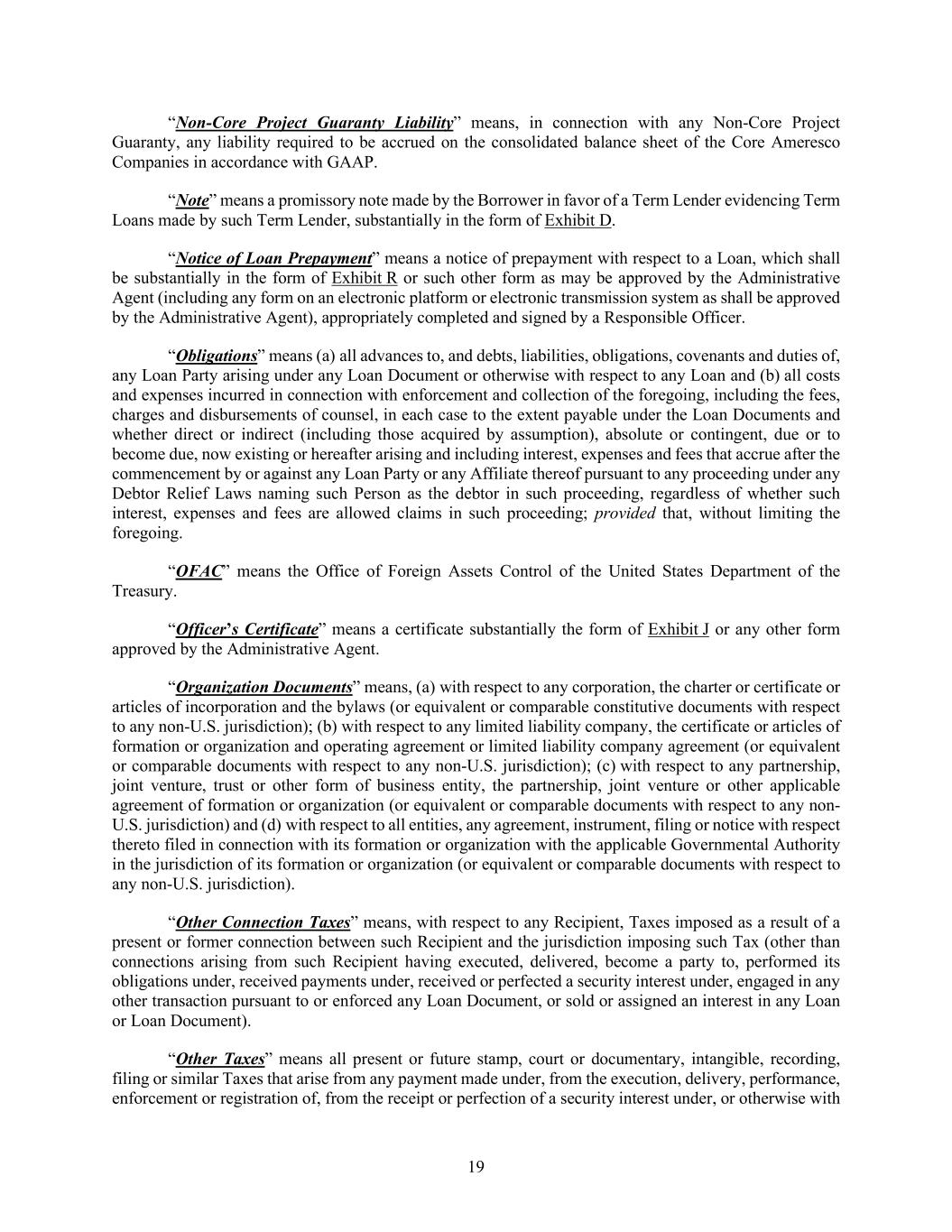 19 “Non-Core Project Guaranty Liability” means, in connection with any Non-Core Project Guaranty, any liability required to be accrued on the consolidated balance sheet of the Core Ameresco Companies in accordance with GAAP. “Note” means a promissory note made by the Borrower in favor of a Term Lender evidencing Term Loans made by such Term Lender, substantially in the form of Exhibit D. “Notice of Loan Prepayment” means a notice of prepayment with respect to a Loan, which shall be substantially in the form of Exhibit R or such other form as may be approved by the Administrative Agent (including any form on an electronic platform or electronic transmission system as shall be approved by the Administrative Agent), appropriately completed and signed by a Responsible Officer. “Obligations” means (a) all advances to, and debts, liabilities, obligations, covenants and duties of, any Loan Party arising under any Loan Document or otherwise with respect to any Loan and (b) all costs and expenses incurred in connection with enforcement and collection of the foregoing, including the fees, charges and disbursements of counsel, in each case to the extent payable under the Loan Documents and whether direct or indirect (including those acquired by assumption), absolute or contingent, due or to become due, now existing or hereafter arising and including interest, expenses and fees that accrue after the commencement by or against any Loan Party or any Affiliate thereof pursuant to any proceeding under any Debtor Relief Laws naming such Person as the debtor in such proceeding, regardless of whether such interest, expenses and fees are allowed claims in such proceeding; provided that, without limiting the foregoing. “OFAC” means the Office of Foreign Assets Control of the United States Department of the Treasury. “Officer’s Certificate” means a certificate substantially the form of Exhibit J or any other form approved by the Administrative Agent. “Organization Documents” means, (a) with respect to any corporation, the charter or certificate or articles of incorporation and the bylaws (or equivalent or comparable constitutive documents with respect to any non-U.S. jurisdiction); (b) with respect to any limited liability company, the certificate or articles of formation or organization and operating agreement or limited liability company agreement (or equivalent or comparable documents with respect to any non-U.S. jurisdiction); (c) with respect to any partnership, joint venture, trust or other form of business entity, the partnership, joint venture or other applicable agreement of formation or organization (or equivalent or comparable documents with respect to any non- U.S. jurisdiction) and (d) with respect to all entities, any agreement, instrument, filing or notice with respect thereto filed in connection with its formation or organization with the applicable Governmental Authority in the jurisdiction of its formation or organization (or equivalent or comparable documents with respect to any non-U.S. jurisdiction). “Other Connection Taxes” means, with respect to any Recipient, Taxes imposed as a result of a present or former connection between such Recipient and the jurisdiction imposing such Tax (other than connections arising from such Recipient having executed, delivered, become a party to, performed its obligations under, received payments under, received or perfected a security interest under, engaged in any other transaction pursuant to or enforced any Loan Document, or sold or assigned an interest in any Loan or Loan Document). “Other Taxes” means all present or future stamp, court or documentary, intangible, recording, filing or similar Taxes that arise from any payment made under, from the execution, delivery, performance, enforcement or registration of, from the receipt or perfection of a security interest under, or otherwise with