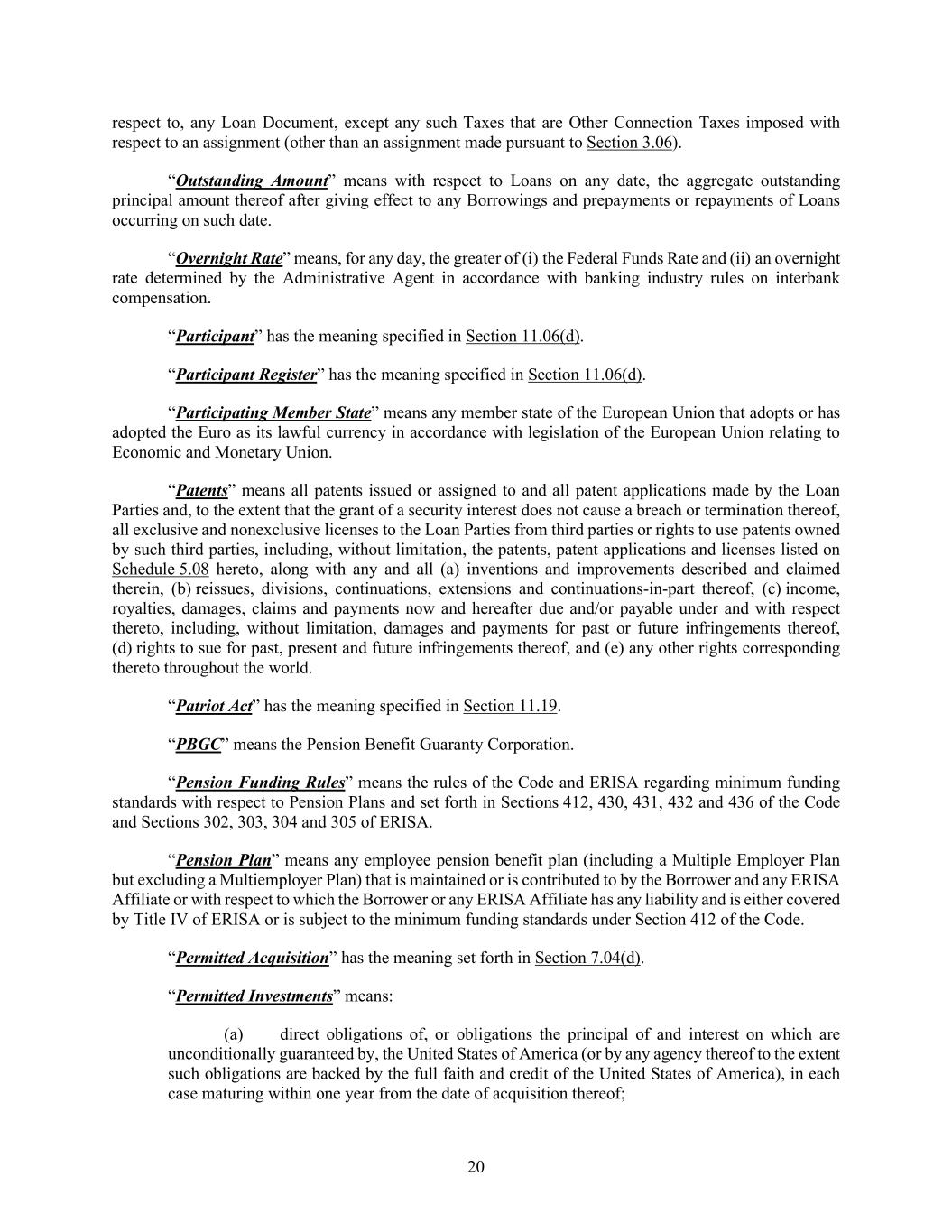 20 respect to, any Loan Document, except any such Taxes that are Other Connection Taxes imposed with respect to an assignment (other than an assignment made pursuant to Section 3.06). “Outstanding Amount” means with respect to Loans on any date, the aggregate outstanding principal amount thereof after giving effect to any Borrowings and prepayments or repayments of Loans occurring on such date. “Overnight Rate” means, for any day, the greater of (i) the Federal Funds Rate and (ii) an overnight rate determined by the Administrative Agent in accordance with banking industry rules on interbank compensation. “Participant” has the meaning specified in Section 11.06(d). “Participant Register” has the meaning specified in Section 11.06(d). “Participating Member State” means any member state of the European Union that adopts or has adopted the Euro as its lawful currency in accordance with legislation of the European Union relating to Economic and Monetary Union. “Patents” means all patents issued or assigned to and all patent applications made by the Loan Parties and, to the extent that the grant of a security interest does not cause a breach or termination thereof, all exclusive and nonexclusive licenses to the Loan Parties from third parties or rights to use patents owned by such third parties, including, without limitation, the patents, patent applications and licenses listed on Schedule 5.08 hereto, along with any and all (a) inventions and improvements described and claimed therein, (b) reissues, divisions, continuations, extensions and continuations-in-part thereof, (c) income, royalties, damages, claims and payments now and hereafter due and/or payable under and with respect thereto, including, without limitation, damages and payments for past or future infringements thereof, (d) rights to sue for past, present and future infringements thereof, and (e) any other rights corresponding thereto throughout the world. “Patriot Act” has the meaning specified in Section 11.19. “PBGC” means the Pension Benefit Guaranty Corporation. “Pension Funding Rules” means the rules of the Code and ERISA regarding minimum funding standards with respect to Pension Plans and set forth in Sections 412, 430, 431, 432 and 436 of the Code and Sections 302, 303, 304 and 305 of ERISA. “Pension Plan” means any employee pension benefit plan (including a Multiple Employer Plan but excluding a Multiemployer Plan) that is maintained or is contributed to by the Borrower and any ERISA Affiliate or with respect to which the Borrower or any ERISA Affiliate has any liability and is either covered by Title IV of ERISA or is subject to the minimum funding standards under Section 412 of the Code. “Permitted Acquisition” has the meaning set forth in Section 7.04(d). “Permitted Investments” means: (a) direct obligations of, or obligations the principal of and interest on which are unconditionally guaranteed by, the United States of America (or by any agency thereof to the extent such obligations are backed by the full faith and credit of the United States of America), in each case maturing within one year from the date of acquisition thereof;