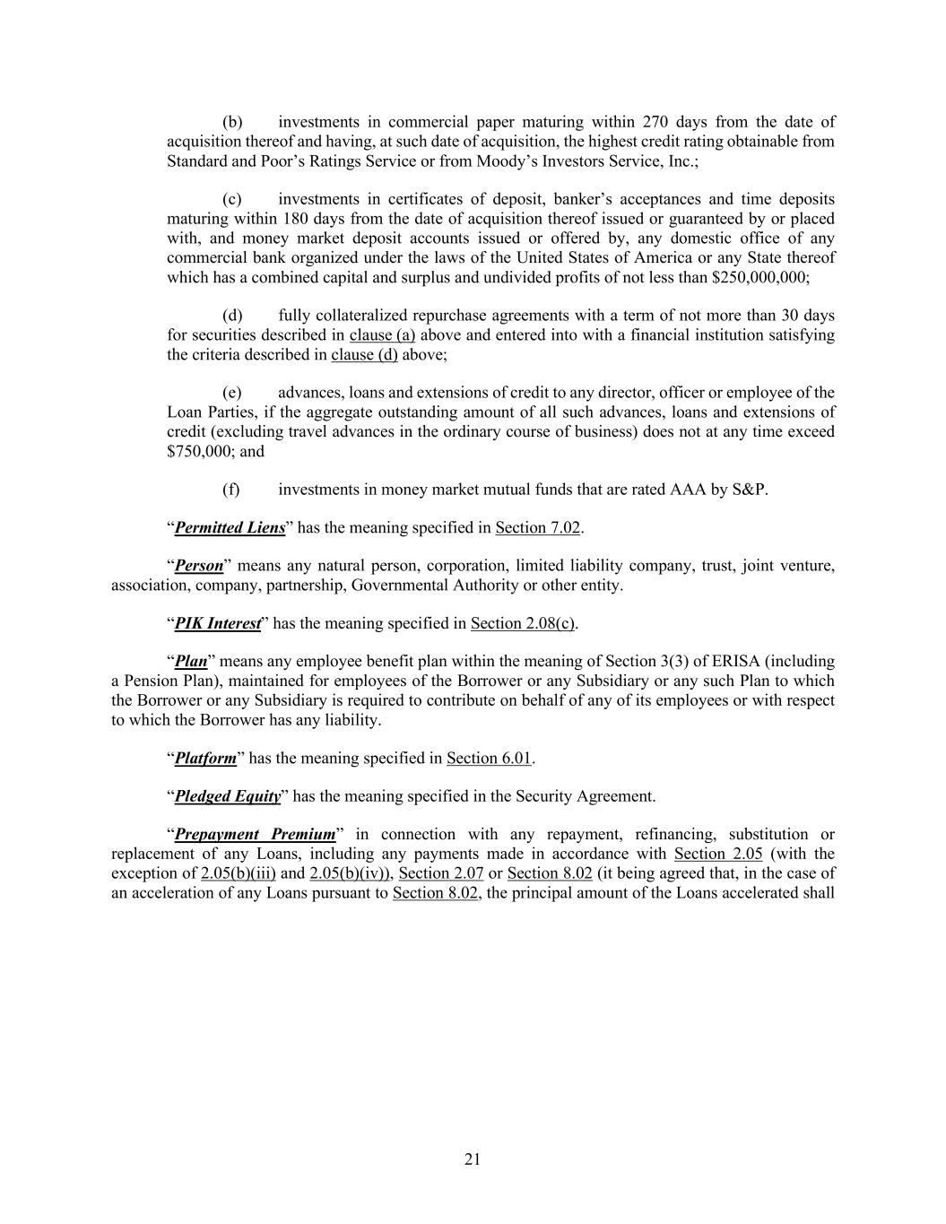 21 (b) investments in commercial paper maturing within 270 days from the date of acquisition thereof and having, at such date of acquisition, the highest credit rating obtainable from Standard and Poor’s Ratings Service or from Moody’s Investors Service, Inc.; (c) investments in certificates of deposit, banker’s acceptances and time deposits maturing within 180 days from the date of acquisition thereof issued or guaranteed by or placed with, and money market deposit accounts issued or offered by, any domestic office of any commercial bank organized under the laws of the United States of America or any State thereof which has a combined capital and surplus and undivided profits of not less than $250,000,000; (d) fully collateralized repurchase agreements with a term of not more than 30 days for securities described in clause (a) above and entered into with a financial institution satisfying the criteria described in clause (d) above; (e) advances, loans and extensions of credit to any director, officer or employee of the Loan Parties, if the aggregate outstanding amount of all such advances, loans and extensions of credit (excluding travel advances in the ordinary course of business) does not at any time exceed $750,000; and (f) investments in money market mutual funds that are rated AAA by S&P. “Permitted Liens” has the meaning specified in Section 7.02. “Person” means any natural person, corporation, limited liability company, trust, joint venture, association, company, partnership, Governmental Authority or other entity. “PIK Interest” has the meaning specified in Section 2.08(c). “Plan” means any employee benefit plan within the meaning of Section 3(3) of ERISA (including a Pension Plan), maintained for employees of the Borrower or any Subsidiary or any such Plan to which the Borrower or any Subsidiary is required to contribute on behalf of any of its employees or with respect to which the Borrower has any liability. “Platform” has the meaning specified in Section 6.01. “Pledged Equity” has the meaning specified in the Security Agreement. “Prepayment Premium” in connection with any repayment, refinancing, substitution or replacement of any Loans, including any payments made in accordance with Section 2.05 (with the exception of 2.05(b)(iii) and 2.05(b)(iv)), Section 2.07 or Section 8.02 (it being agreed that, in the case of an acceleration of any Loans pursuant to Section 8.02, the principal amount of the Loans accelerated shall
