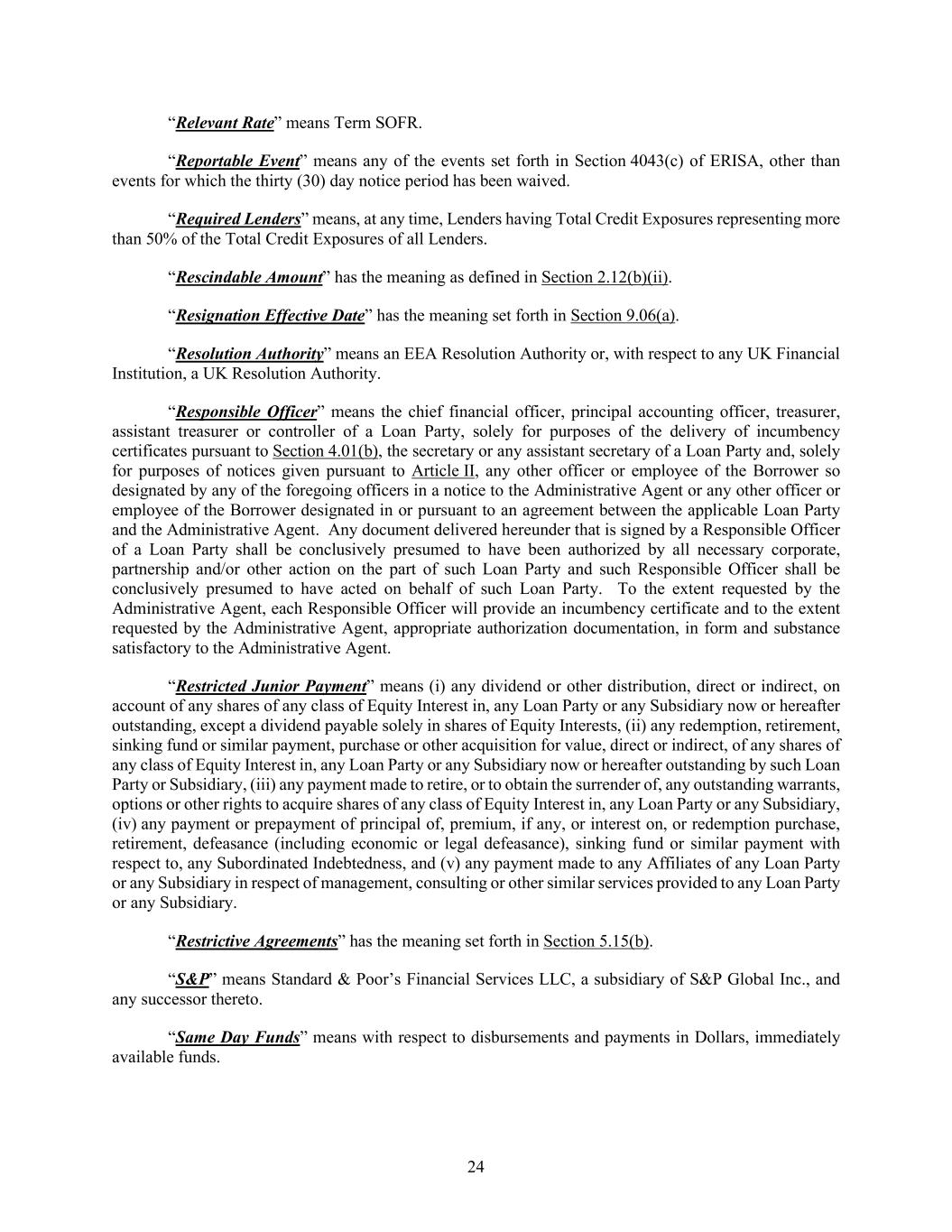 24 “Relevant Rate” means Term SOFR. “Reportable Event” means any of the events set forth in Section 4043(c) of ERISA, other than events for which the thirty (30) day notice period has been waived. “Required Lenders” means, at any time, Lenders having Total Credit Exposures representing more than 50% of the Total Credit Exposures of all Lenders. “Rescindable Amount” has the meaning as defined in Section 2.12(b)(ii). “Resignation Effective Date” has the meaning set forth in Section 9.06(a). “Resolution Authority” means an EEA Resolution Authority or, with respect to any UK Financial Institution, a UK Resolution Authority. “Responsible Officer” means the chief financial officer, principal accounting officer, treasurer, assistant treasurer or controller of a Loan Party, solely for purposes of the delivery of incumbency certificates pursuant to Section 4.01(b), the secretary or any assistant secretary of a Loan Party and, solely for purposes of notices given pursuant to Article II, any other officer or employee of the Borrower so designated by any of the foregoing officers in a notice to the Administrative Agent or any other officer or employee of the Borrower designated in or pursuant to an agreement between the applicable Loan Party and the Administrative Agent. Any document delivered hereunder that is signed by a Responsible Officer of a Loan Party shall be conclusively presumed to have been authorized by all necessary corporate, partnership and/or other action on the part of such Loan Party and such Responsible Officer shall be conclusively presumed to have acted on behalf of such Loan Party. To the extent requested by the Administrative Agent, each Responsible Officer will provide an incumbency certificate and to the extent requested by the Administrative Agent, appropriate authorization documentation, in form and substance satisfactory to the Administrative Agent. “Restricted Junior Payment” means (i) any dividend or other distribution, direct or indirect, on account of any shares of any class of Equity Interest in, any Loan Party or any Subsidiary now or hereafter outstanding, except a dividend payable solely in shares of Equity Interests, (ii) any redemption, retirement, sinking fund or similar payment, purchase or other acquisition for value, direct or indirect, of any shares of any class of Equity Interest in, any Loan Party or any Subsidiary now or hereafter outstanding by such Loan Party or Subsidiary, (iii) any payment made to retire, or to obtain the surrender of, any outstanding warrants, options or other rights to acquire shares of any class of Equity Interest in, any Loan Party or any Subsidiary, (iv) any payment or prepayment of principal of, premium, if any, or interest on, or redemption purchase, retirement, defeasance (including economic or legal defeasance), sinking fund or similar payment with respect to, any Subordinated Indebtedness, and (v) any payment made to any Affiliates of any Loan Party or any Subsidiary in respect of management, consulting or other similar services provided to any Loan Party or any Subsidiary. “Restrictive Agreements” has the meaning set forth in Section 5.15(b). “S&P” means Standard & Poor’s Financial Services LLC, a subsidiary of S&P Global Inc., and any successor thereto. “Same Day Funds” means with respect to disbursements and payments in Dollars, immediately available funds.