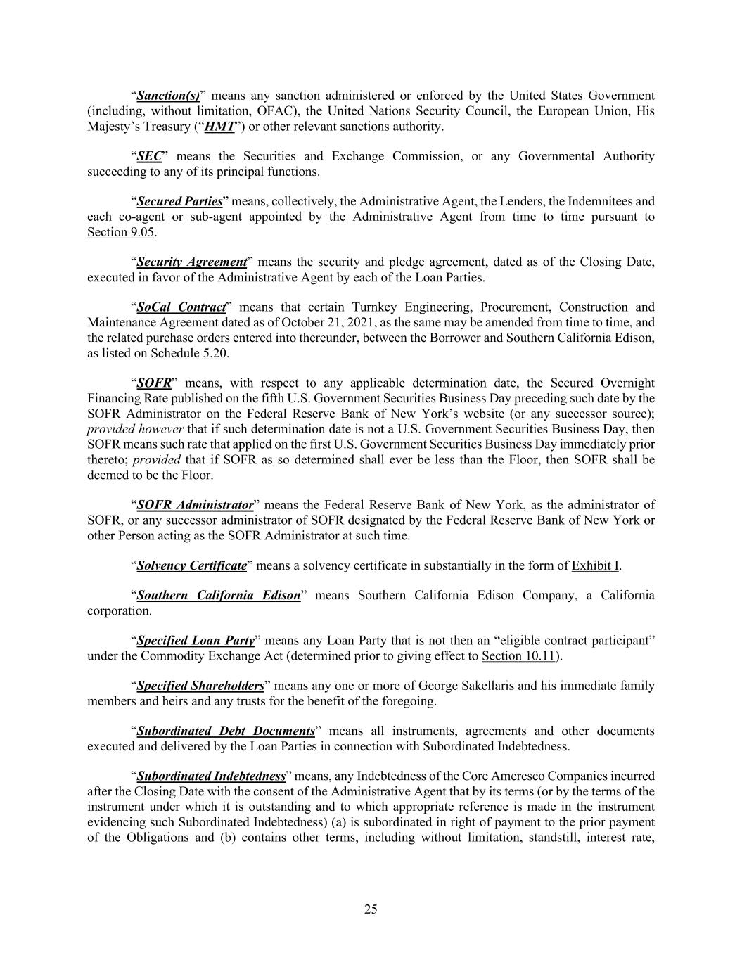 25 “Sanction(s)” means any sanction administered or enforced by the United States Government (including, without limitation, OFAC), the United Nations Security Council, the European Union, His Majesty’s Treasury (“HMT”) or other relevant sanctions authority. “SEC” means the Securities and Exchange Commission, or any Governmental Authority succeeding to any of its principal functions. “Secured Parties” means, collectively, the Administrative Agent, the Lenders, the Indemnitees and each co-agent or sub-agent appointed by the Administrative Agent from time to time pursuant to Section 9.05. “Security Agreement” means the security and pledge agreement, dated as of the Closing Date, executed in favor of the Administrative Agent by each of the Loan Parties. “SoCal Contract” means that certain Turnkey Engineering, Procurement, Construction and Maintenance Agreement dated as of October 21, 2021, as the same may be amended from time to time, and the related purchase orders entered into thereunder, between the Borrower and Southern California Edison, as listed on Schedule 5.20. “SOFR” means, with respect to any applicable determination date, the Secured Overnight Financing Rate published on the fifth U.S. Government Securities Business Day preceding such date by the SOFR Administrator on the Federal Reserve Bank of New York’s website (or any successor source); provided however that if such determination date is not a U.S. Government Securities Business Day, then SOFR means such rate that applied on the first U.S. Government Securities Business Day immediately prior thereto; provided that if SOFR as so determined shall ever be less than the Floor, then SOFR shall be deemed to be the Floor. “SOFR Administrator” means the Federal Reserve Bank of New York, as the administrator of SOFR, or any successor administrator of SOFR designated by the Federal Reserve Bank of New York or other Person acting as the SOFR Administrator at such time. “Solvency Certificate” means a solvency certificate in substantially in the form of Exhibit I. “Southern California Edison” means Southern California Edison Company, a California corporation. “Specified Loan Party” means any Loan Party that is not then an “eligible contract participant” under the Commodity Exchange Act (determined prior to giving effect to Section 10.11). “Specified Shareholders” means any one or more of George Sakellaris and his immediate family members and heirs and any trusts for the benefit of the foregoing. “Subordinated Debt Documents” means all instruments, agreements and other documents executed and delivered by the Loan Parties in connection with Subordinated Indebtedness. “Subordinated Indebtedness” means, any Indebtedness of the Core Ameresco Companies incurred after the Closing Date with the consent of the Administrative Agent that by its terms (or by the terms of the instrument under which it is outstanding and to which appropriate reference is made in the instrument evidencing such Subordinated Indebtedness) (a) is subordinated in right of payment to the prior payment of the Obligations and (b) contains other terms, including without limitation, standstill, interest rate,